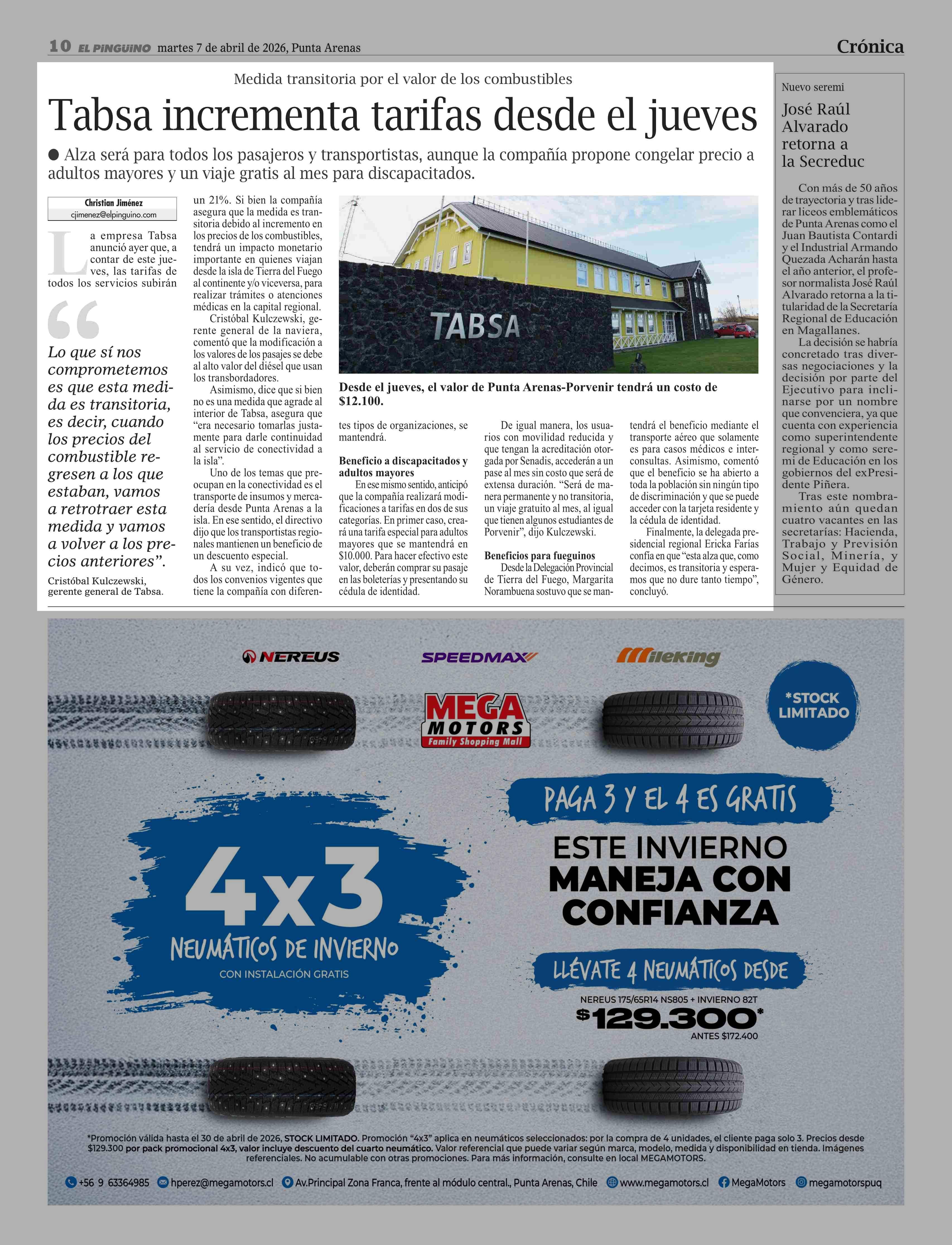 Tabsa incrementa tarifas desde el jueves 07-04-2026 El Pingüino |