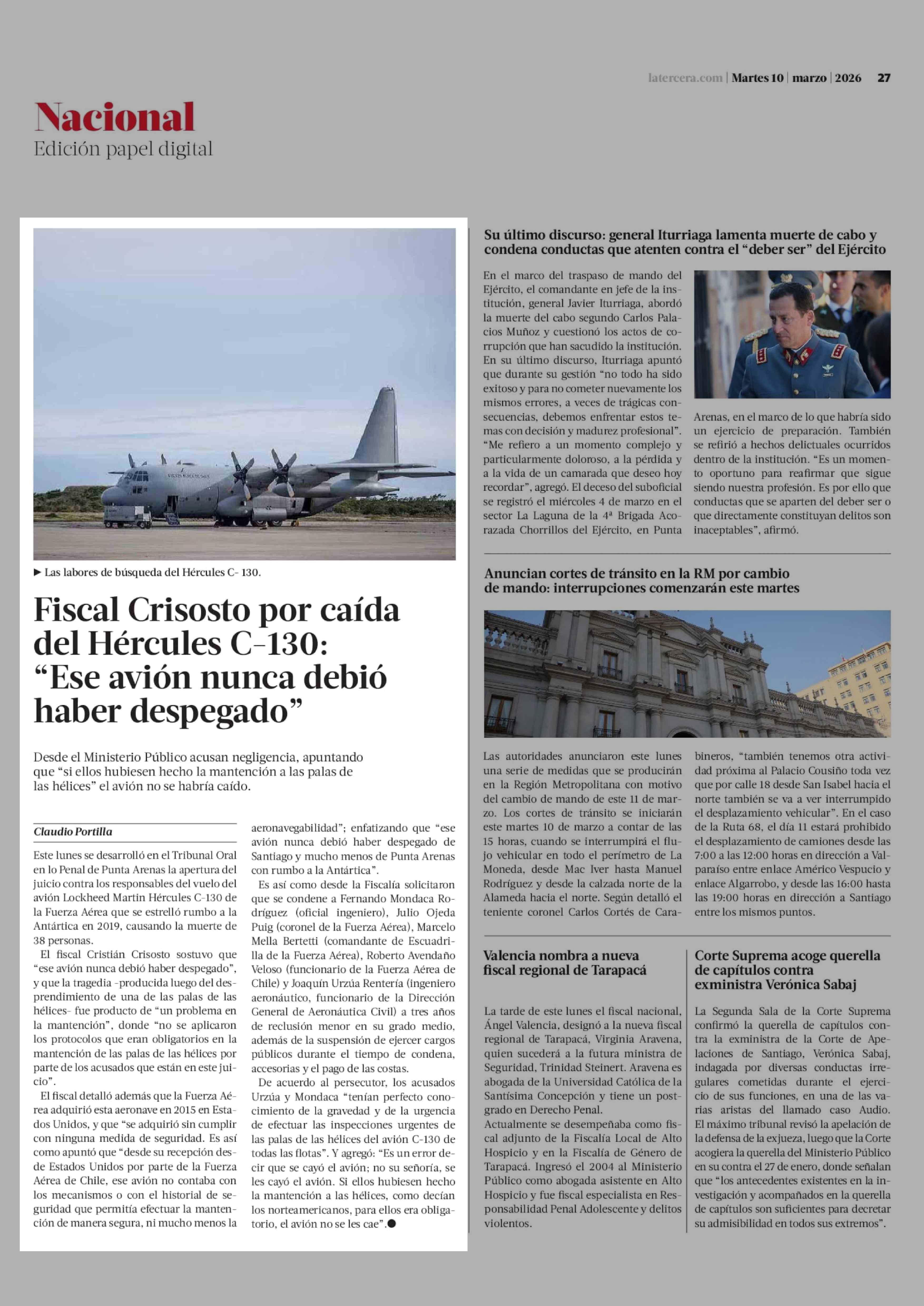 Fiscal Crisosto por caída del Hércules C-130: "Ese avión nunca debió haber despegado" 10-03-2026 La Tercera |