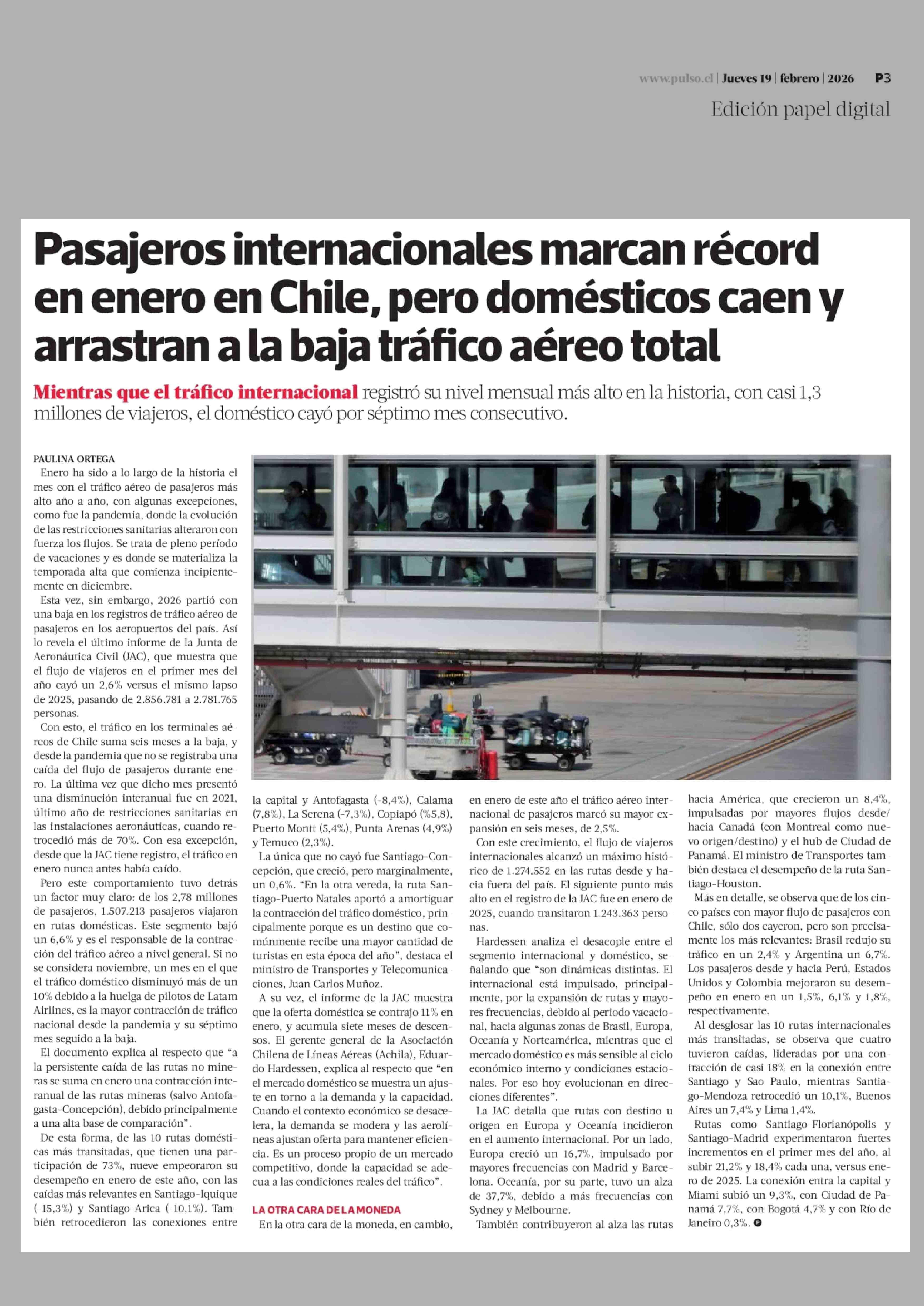 Título: Pasajeros internacionales marcan récord en enero en Chile, pero domésticos caen y arrastran a la baja tráfico aéreo total