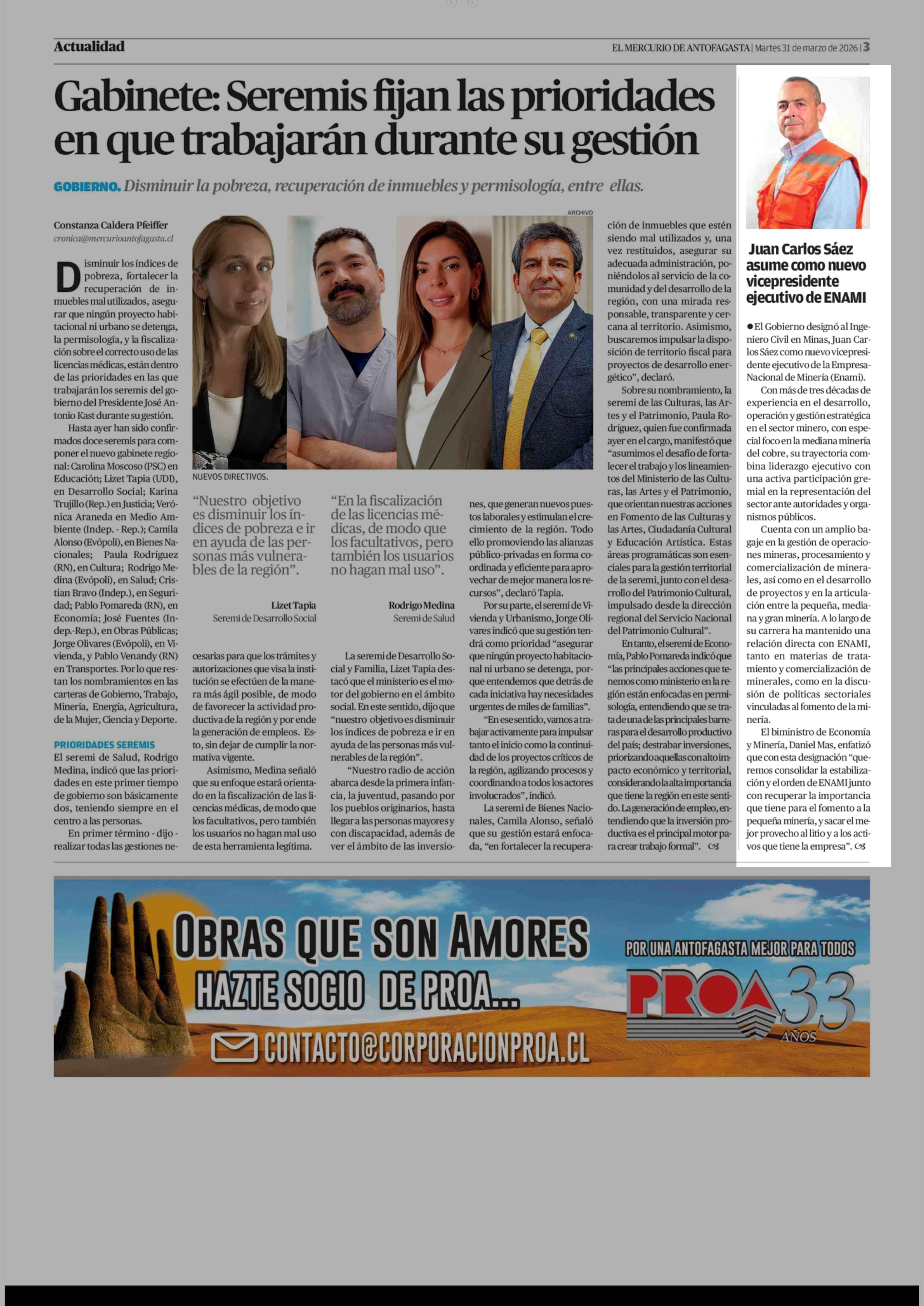 Juan Carlos Sáez asume como nuevo vicepresidente ejecutivo de ENAMI 31-03-2026 El Mercurio de Antofagasta |