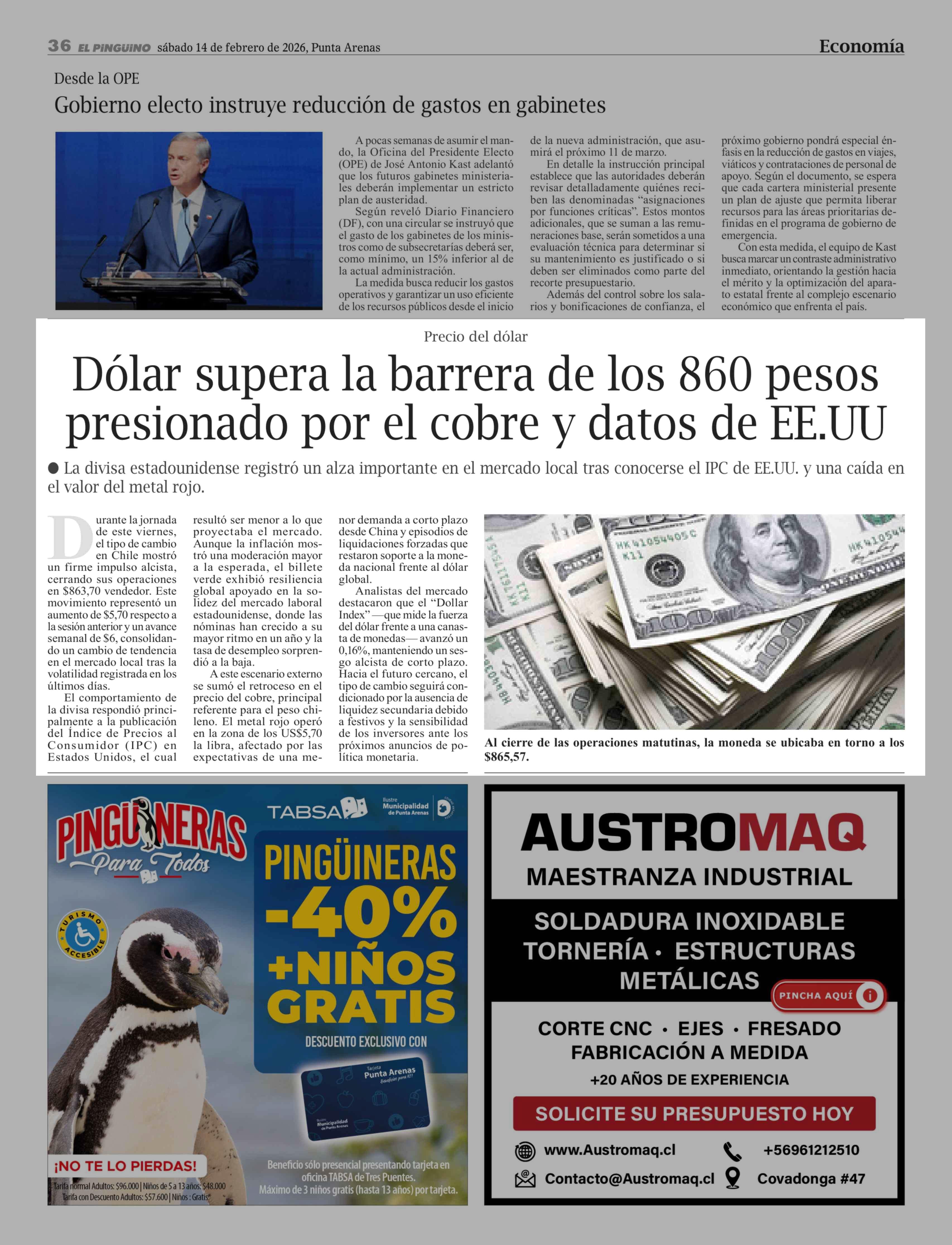 Dólar supera la barrera de los 860 pesos presionado por el cobre y datos de EE.UU 14-02-2026 El Pingüino |