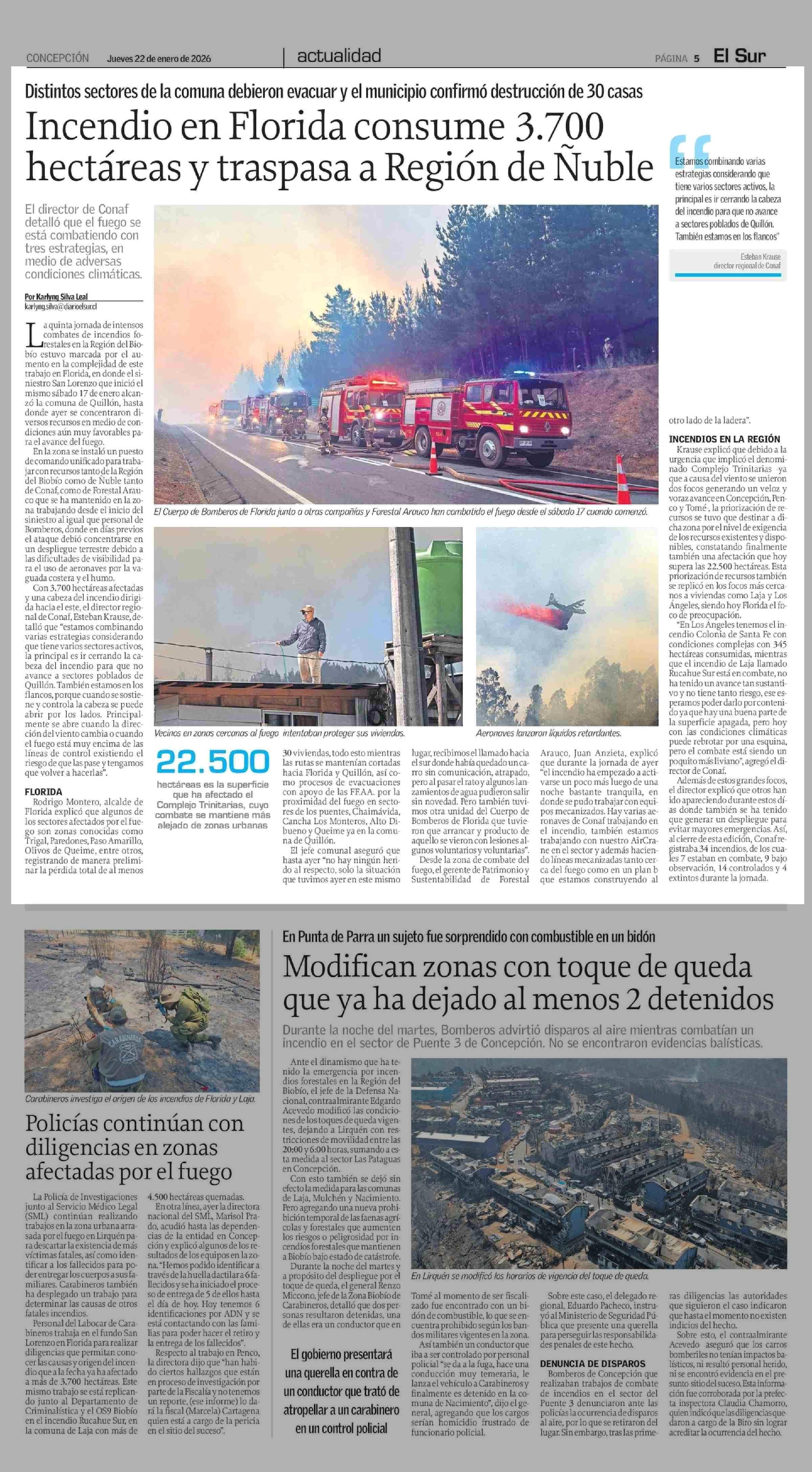 Incendio en Florida consume 3.700 hectáreas y traspasa a Región de Nuble 22-01-2026 El Sur |