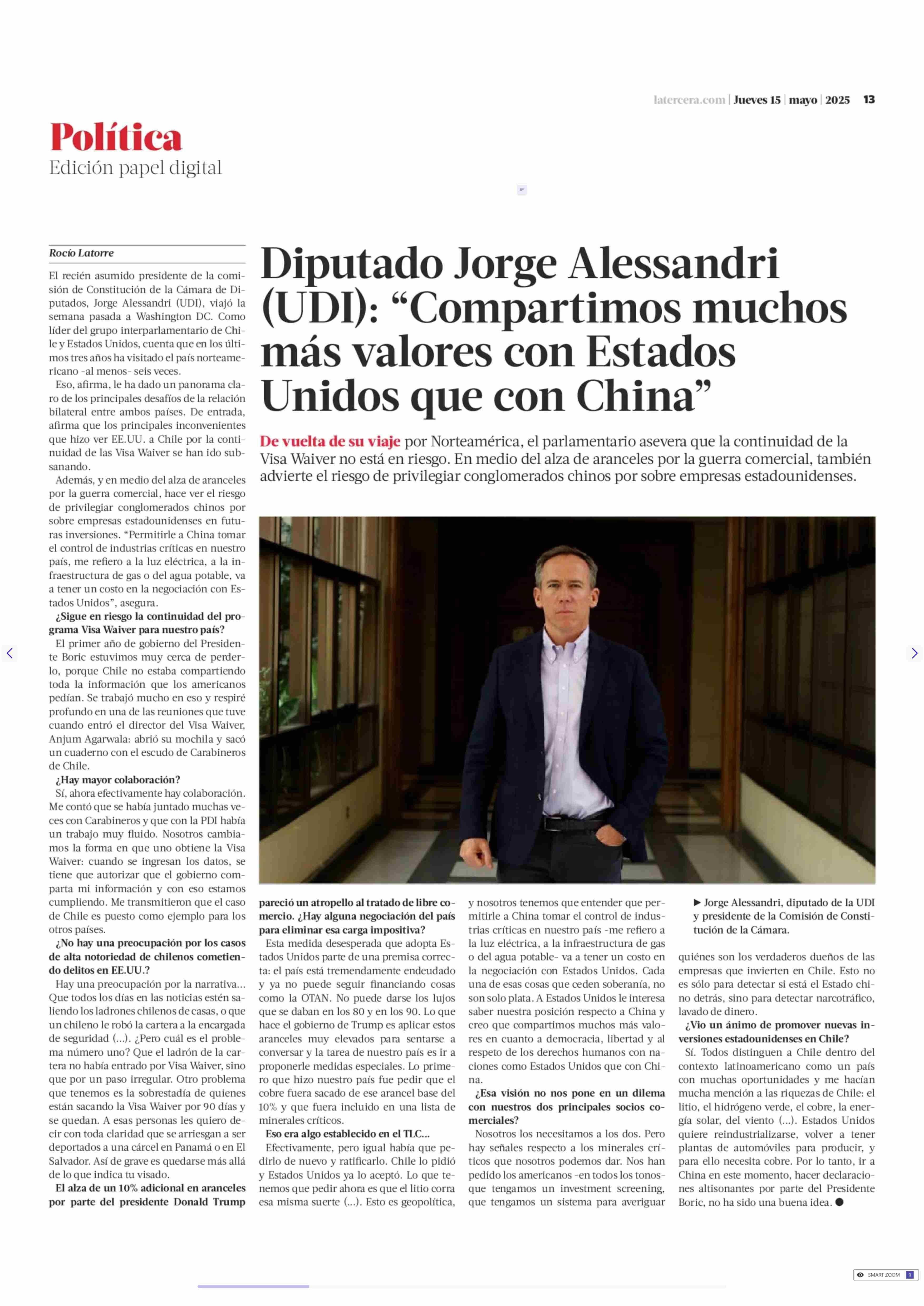 Diputado Jorge Alessandri (UDD: “Compartimos muchos más valores con Estados Unidos que con China” 15-05-2025 La Tercera |