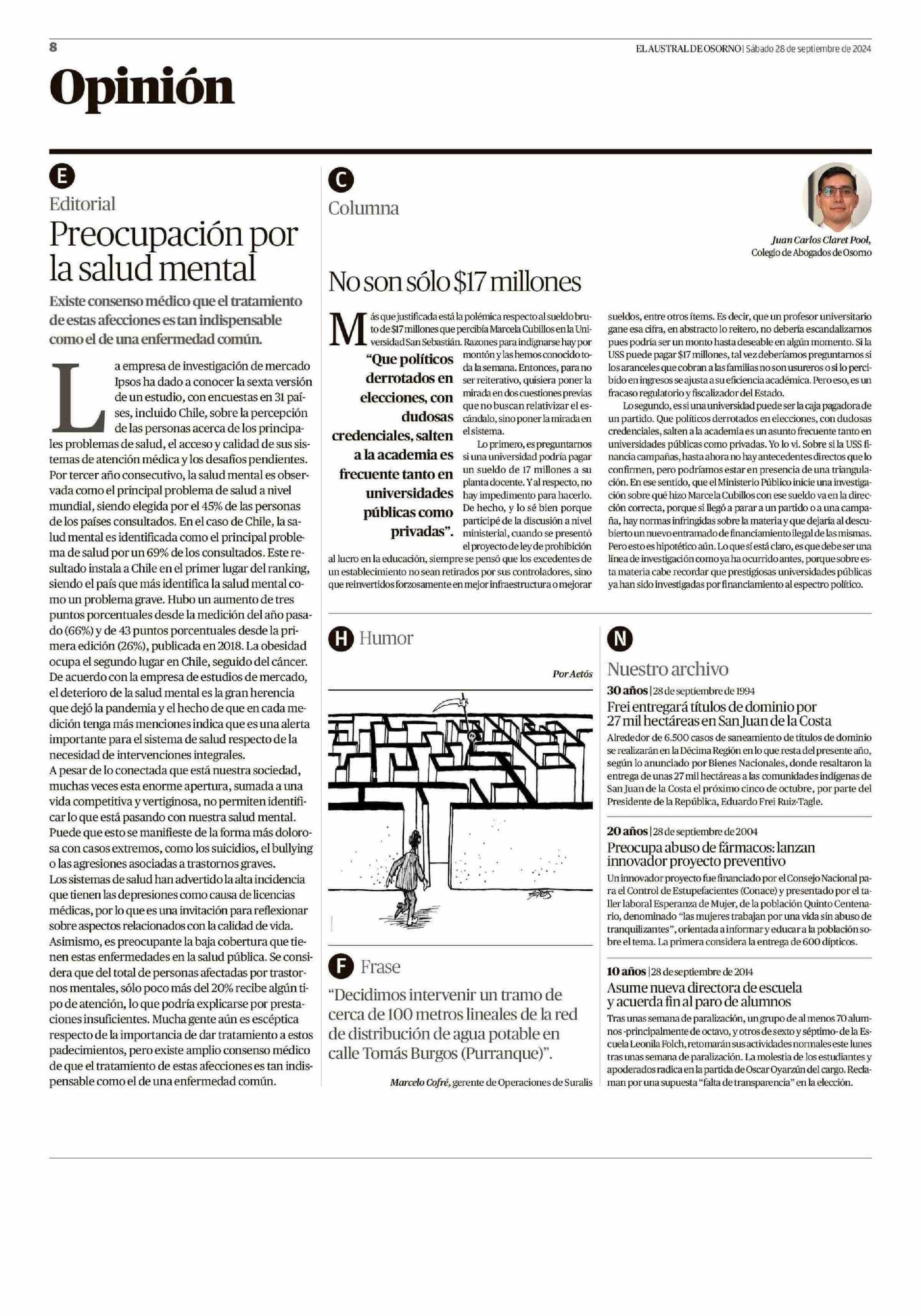 Preocupación por la salud mental 28-09-2024 El Austral de Osorno |
