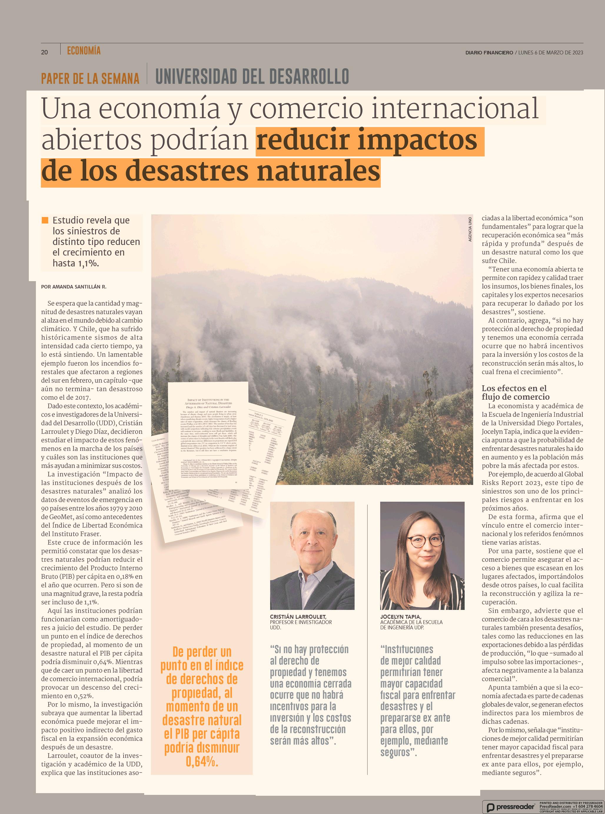 | Una economía y comercio internacional abiertos podrian reducir impactos de los desastres naturales 06-03-2023 Diario Financiero |