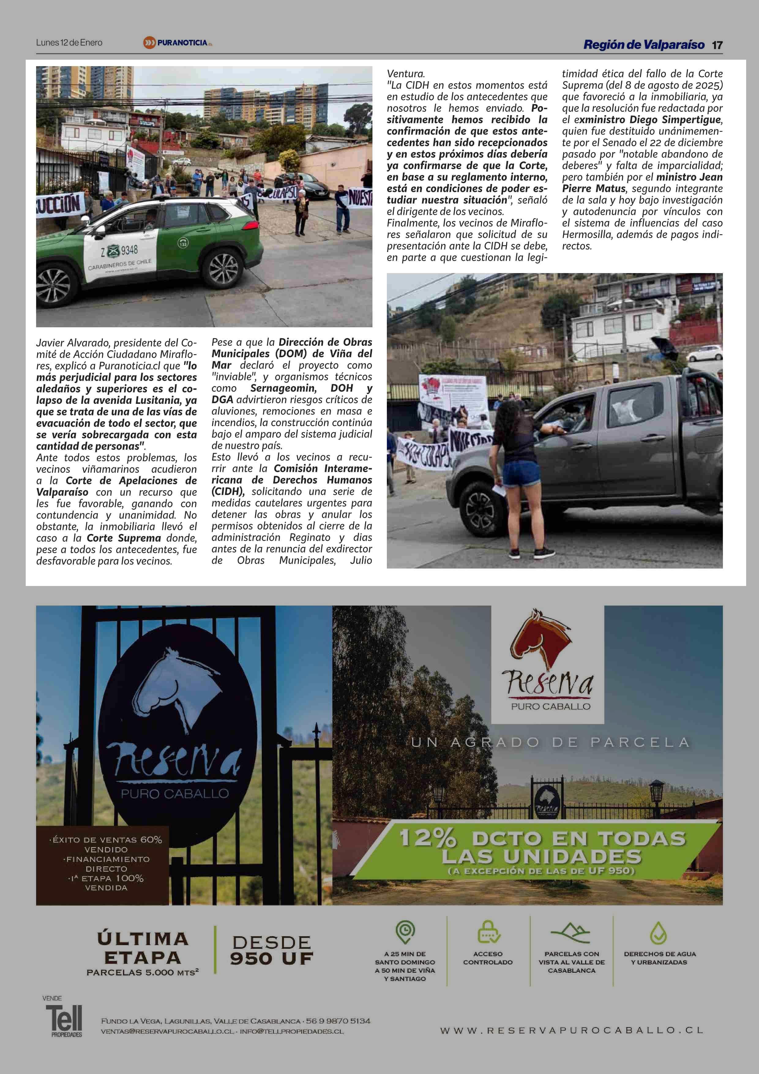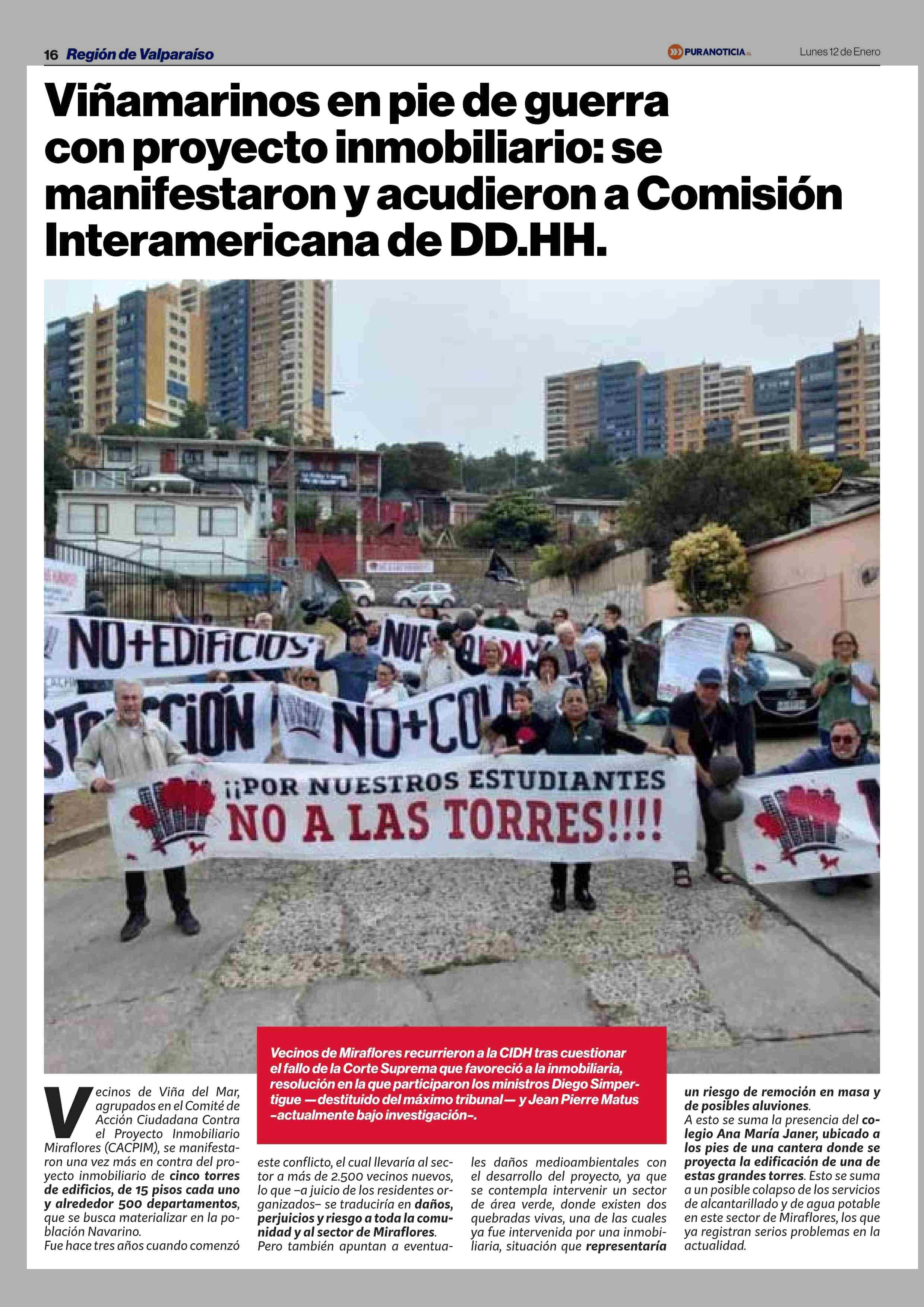 Viñamarinos en pie de guerra con proyecto inmobiliario: se manifestaron y acudieron a Comisión Interamericana de DD.HH. 12-01-2026 Puranoticia.cl |