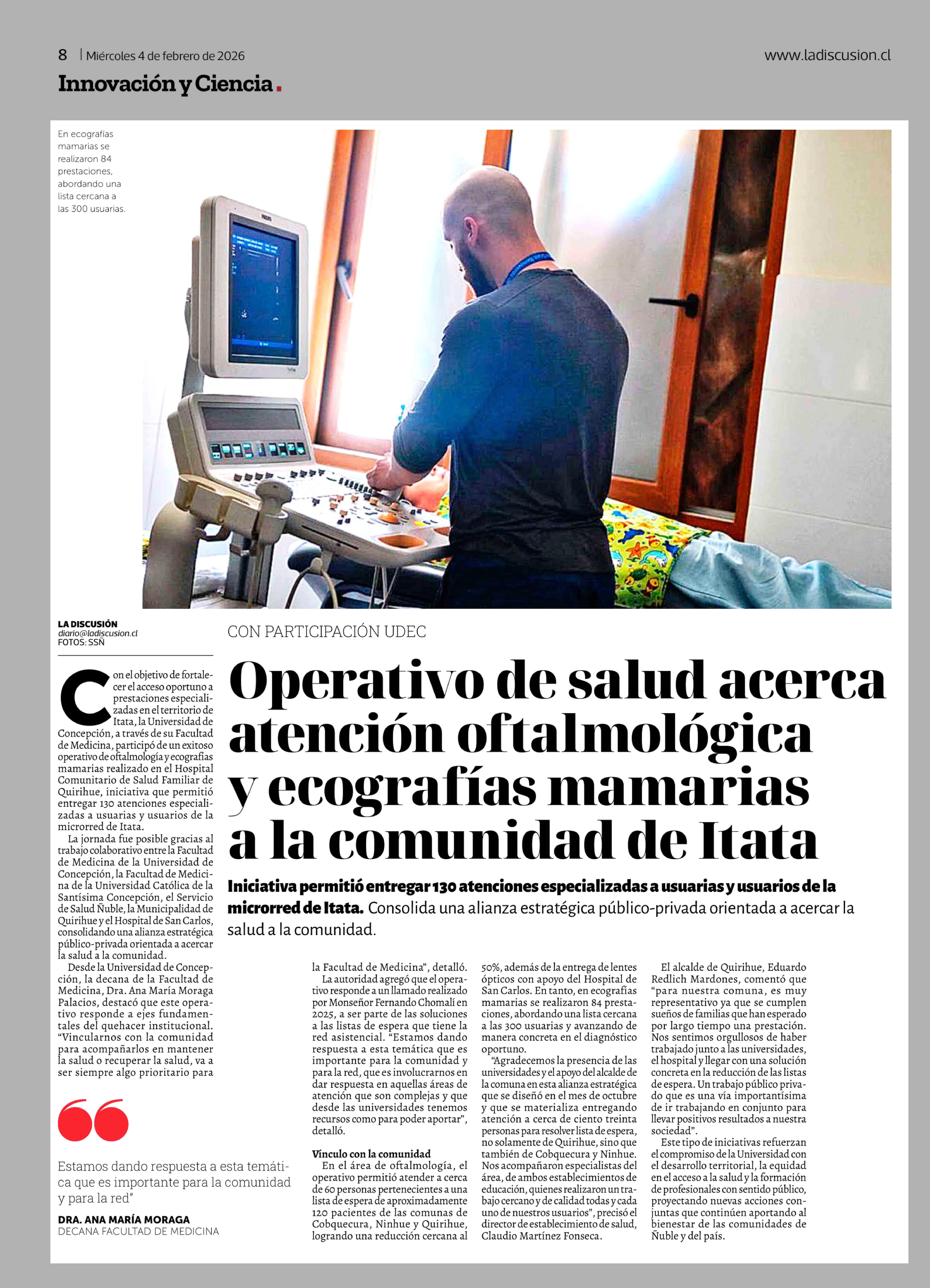 Operativo de salud acerca atención oftalmológica y ecografías mamarias a la comunidad de Itata 04-02-2026 La Discusión |