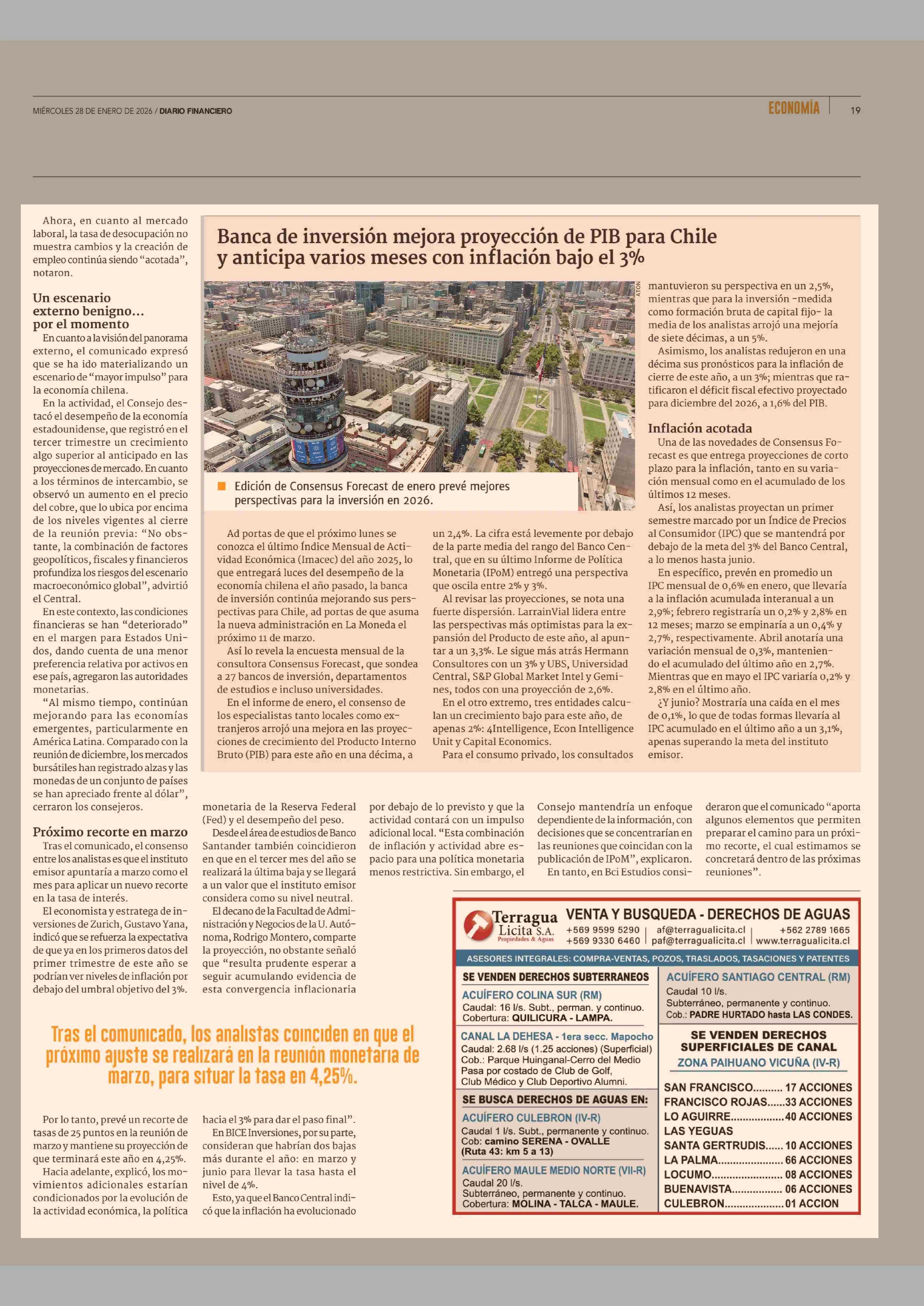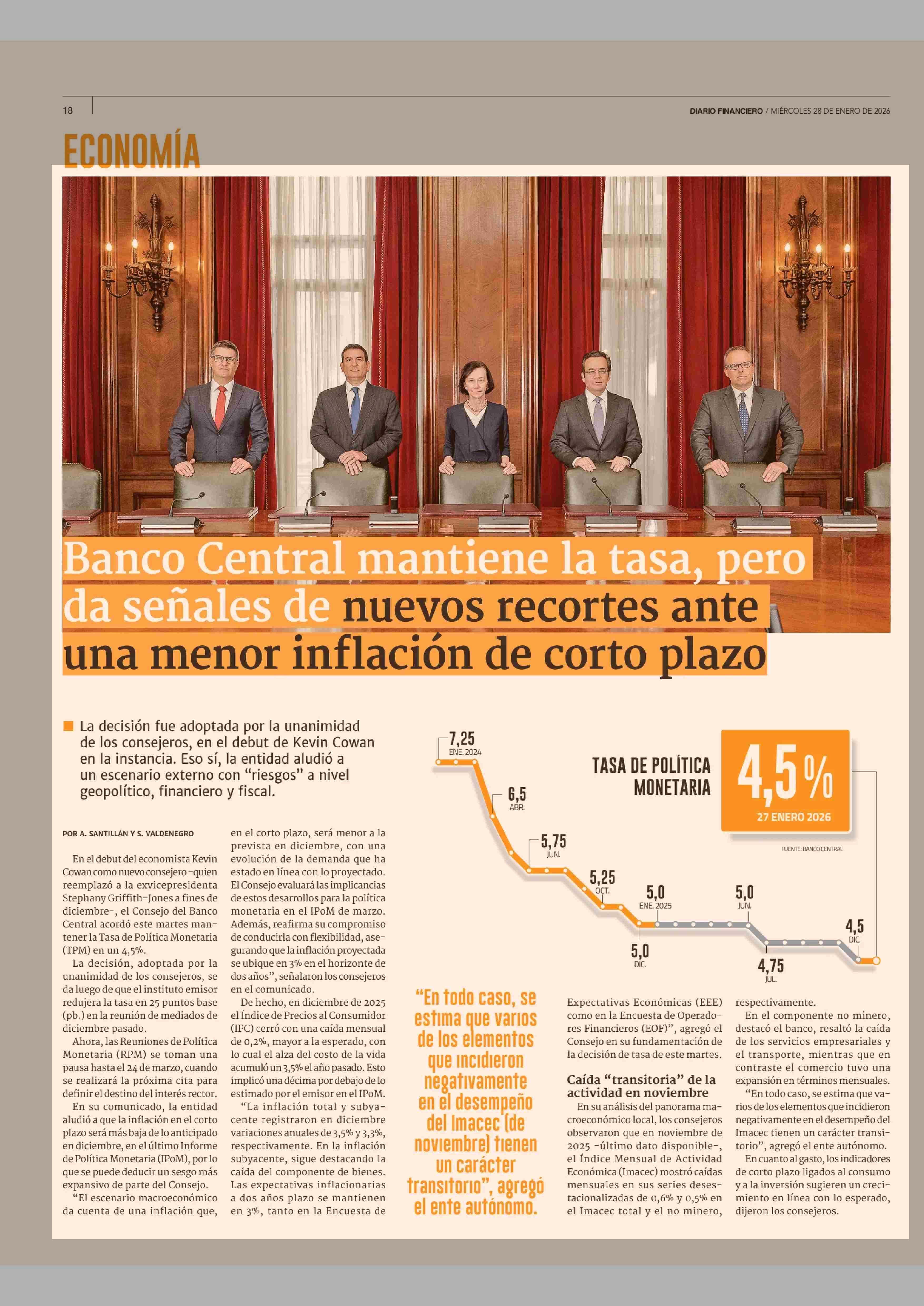 Banco Central mantiene la tasa, pero da señales de nuevos recortes ante una menor inflación de corto plazo 28-01-2026 Diario Financiero |