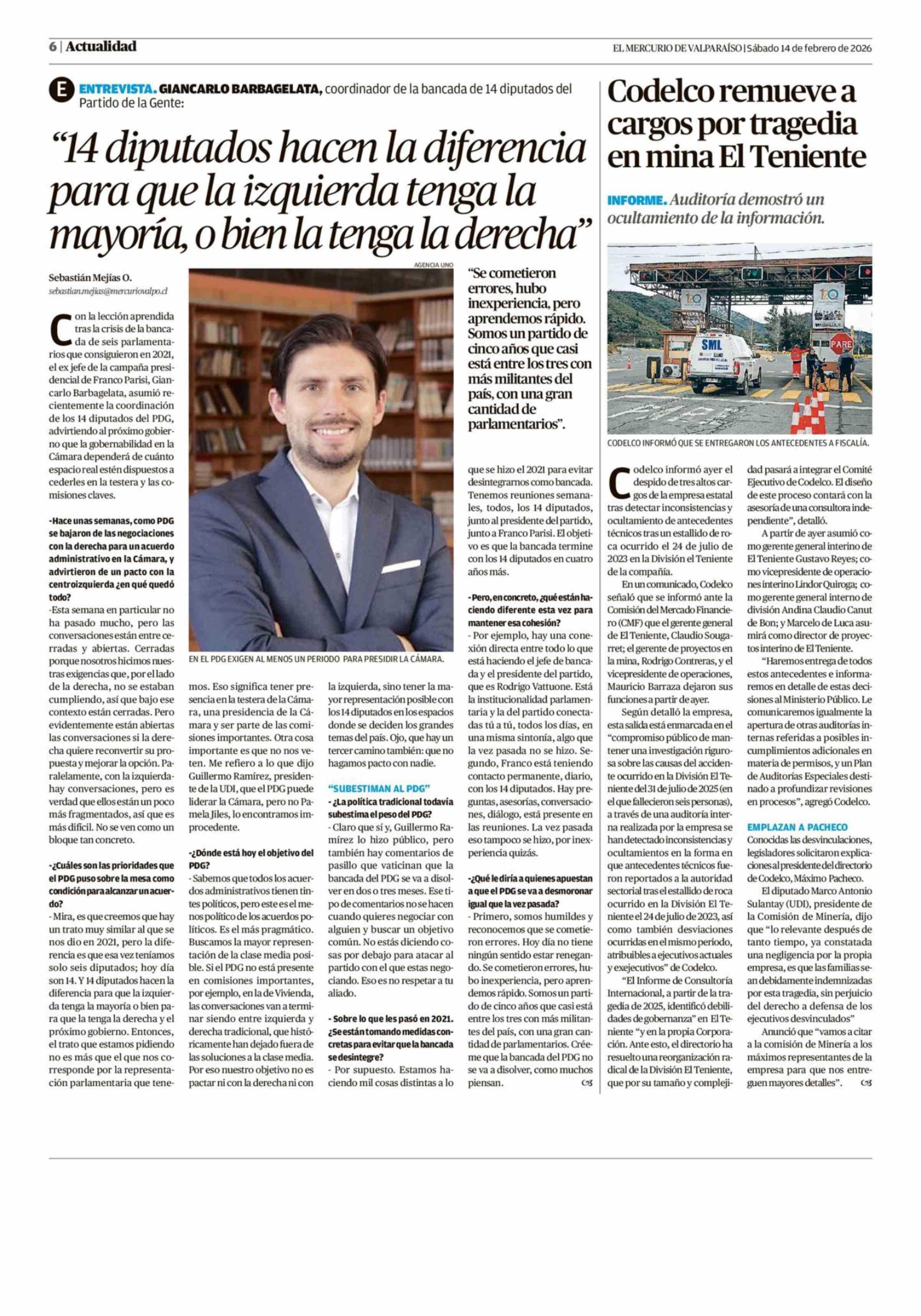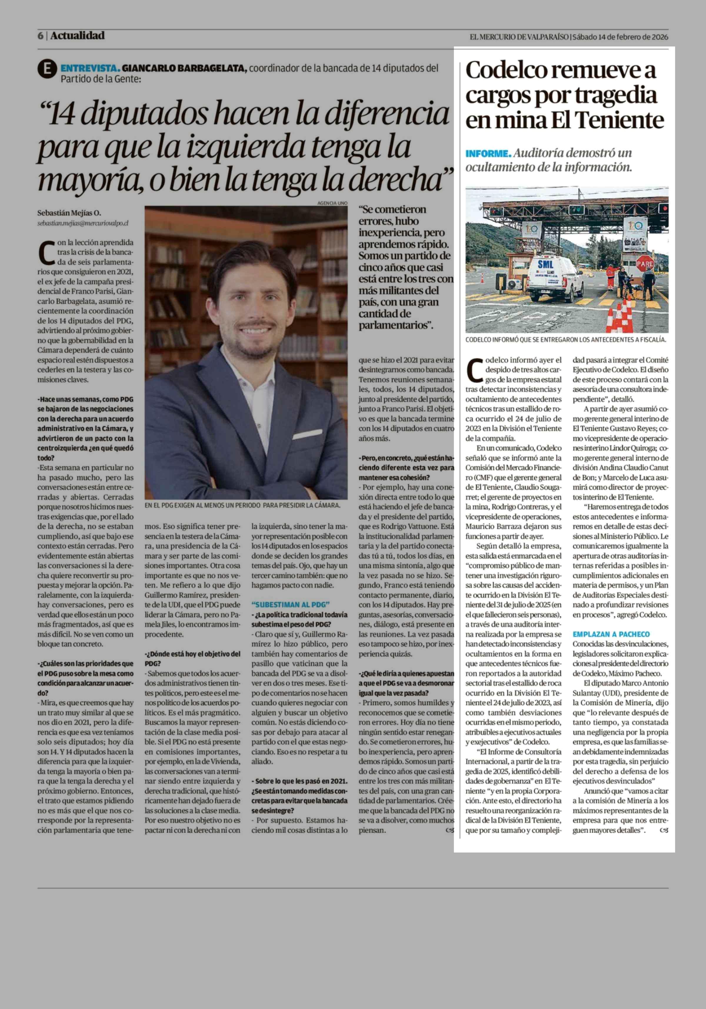 Codelco remueve a cargos por tragedia en mina El Teniente 14-02-2026 El Mercurio de Valparaíso |