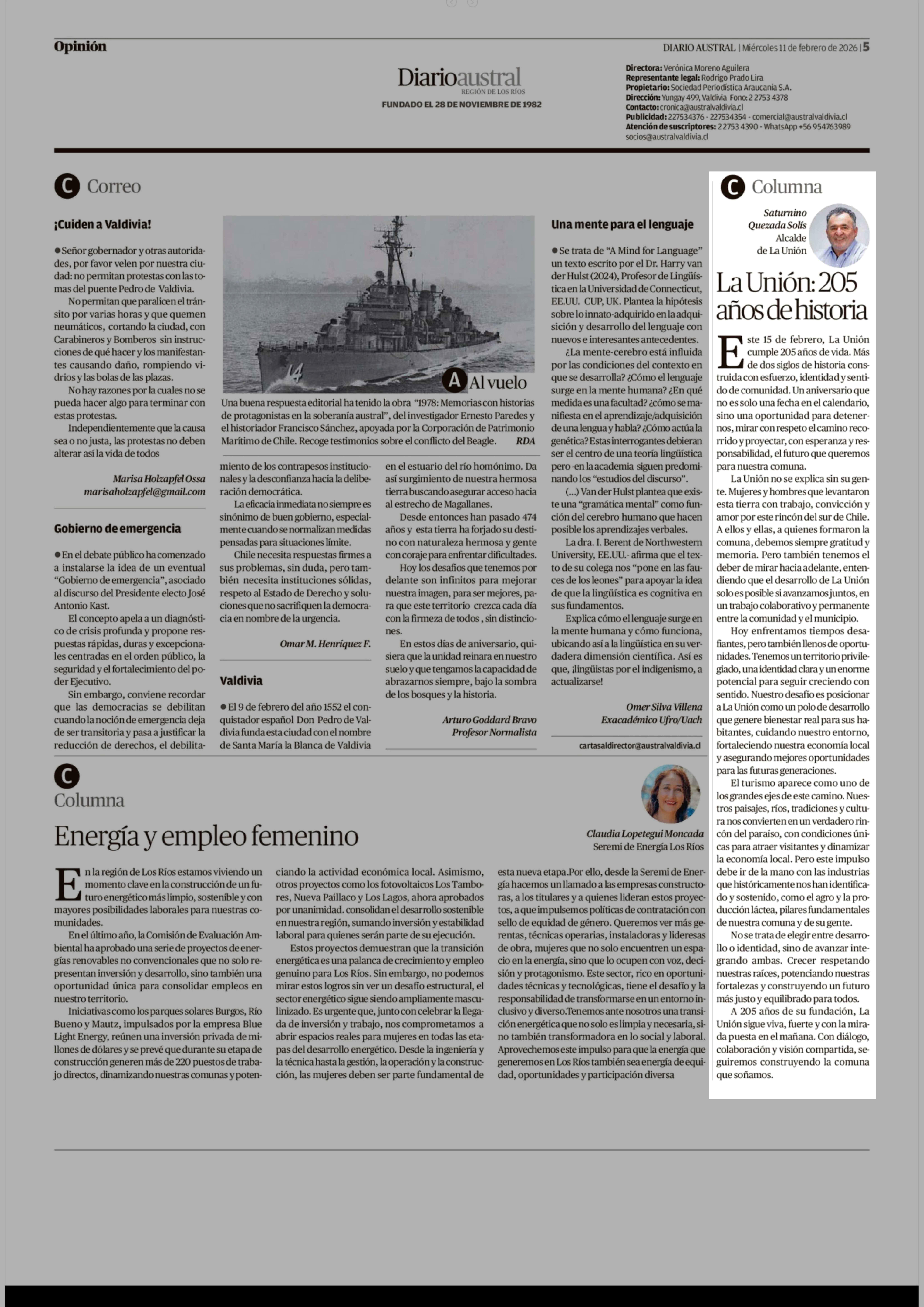 Columnas de Opinión: La Unión: 205 años de historia 11-02-2026 Diario Austral Región de Los Ríos |
