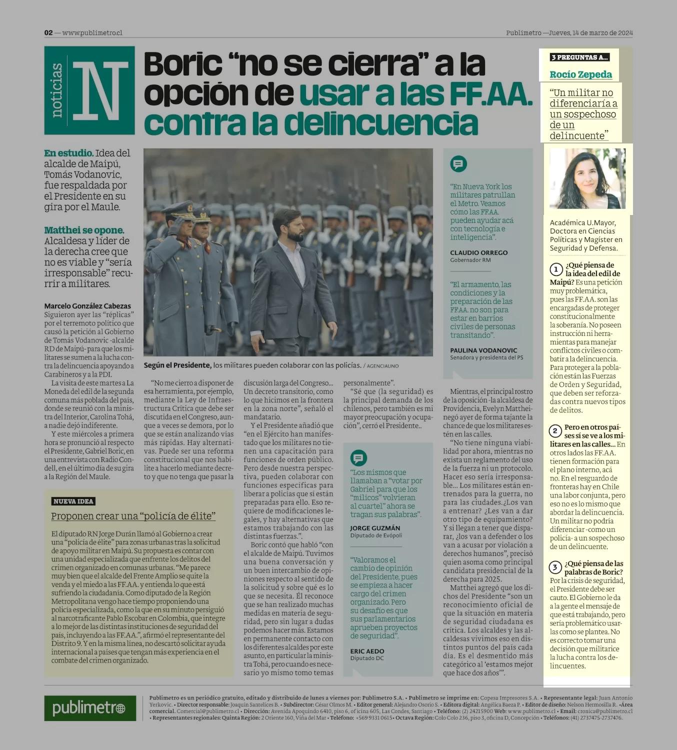 Rocío Zepeda “Un militar no diferenciaría a un sospechoso de un delincuente” 14-03-2024 Publimetro |