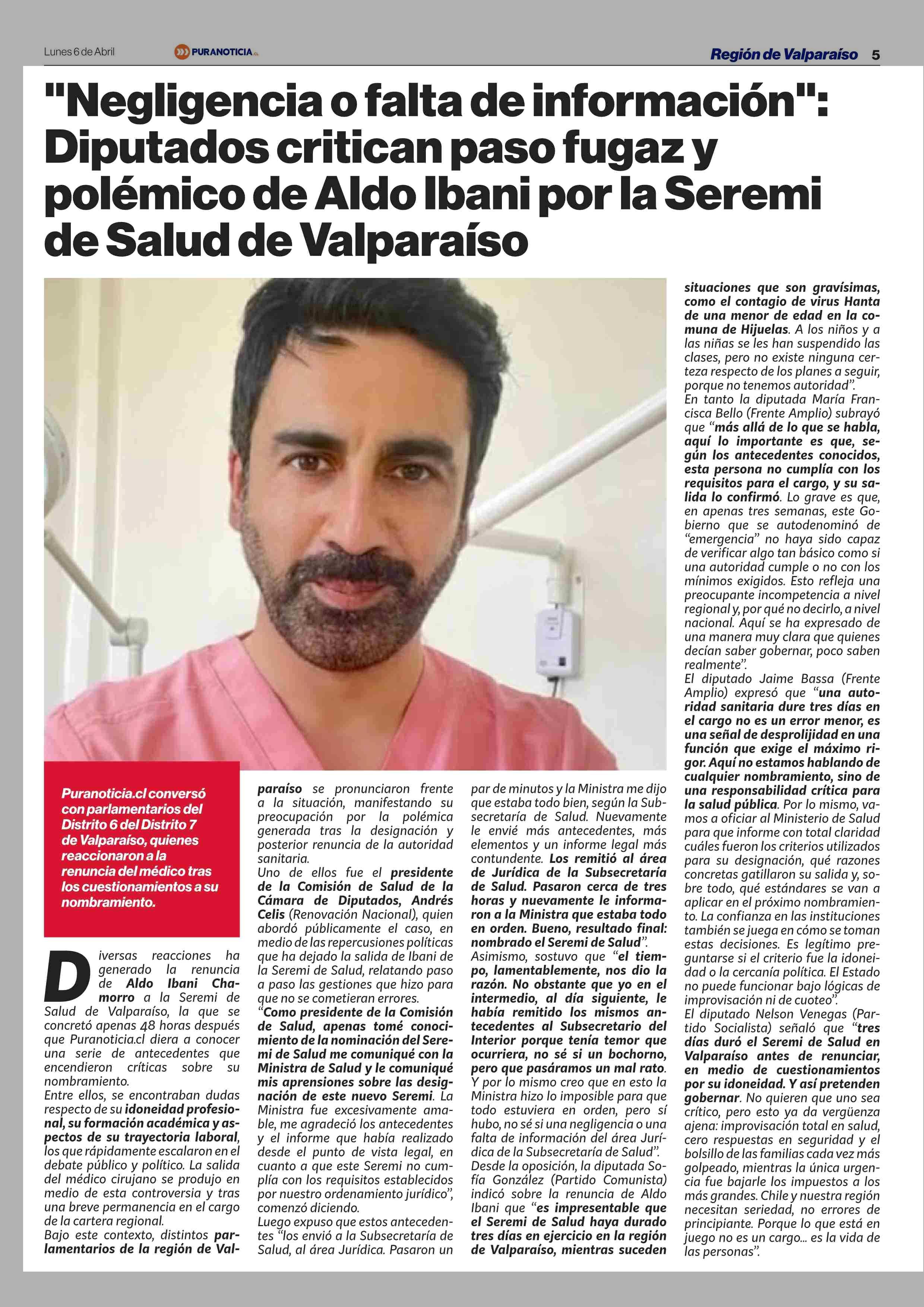 "Negligencia o falta de información": Diputados critican paso fugaz y polémico de Aldo Ibani por la Seremi de Salud de Valparaiso 06-04-2026 Puranoticia.cl |