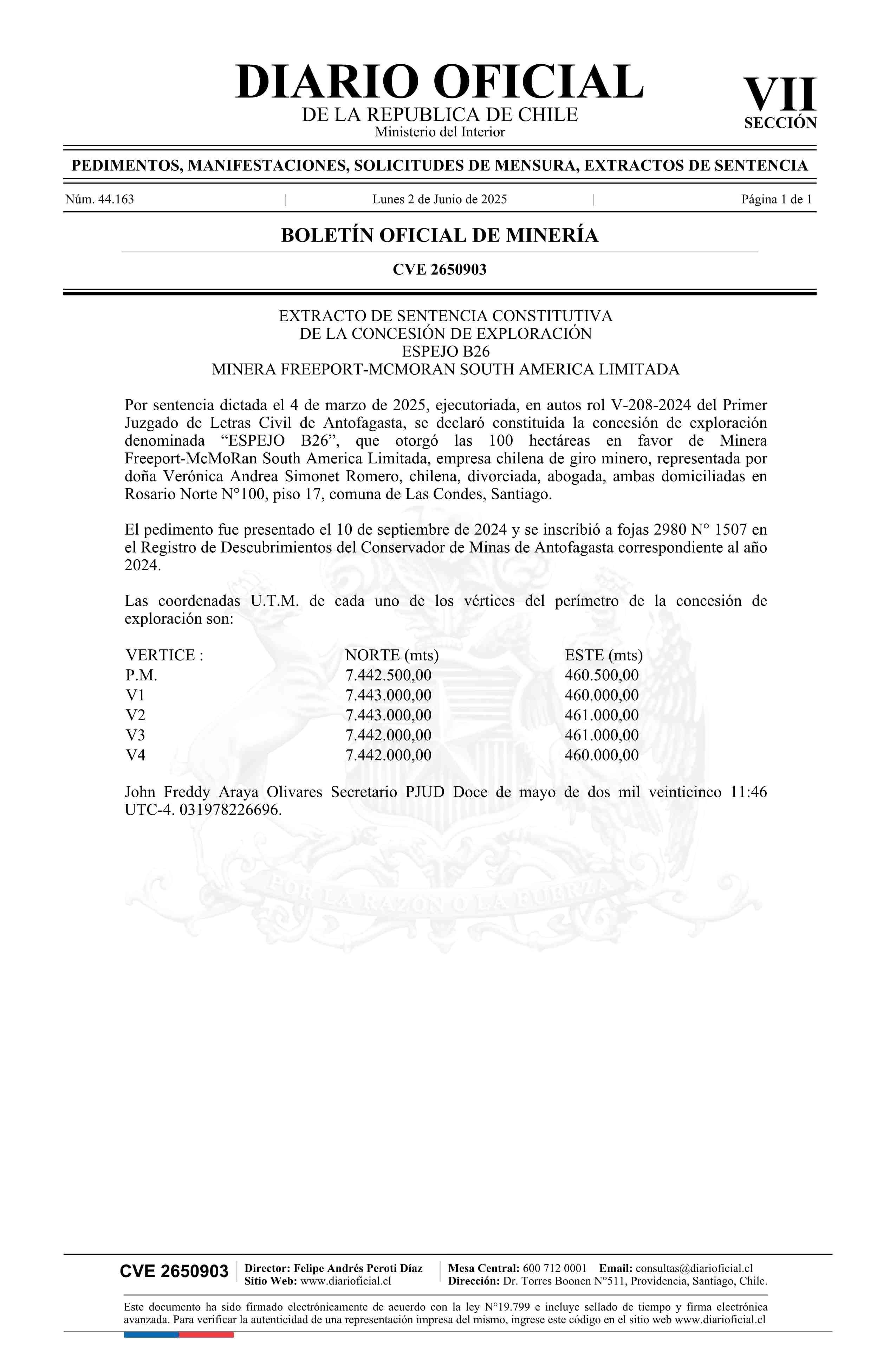 ESPEJO B26 / Minera Freeport-McMoRan South America Limitada 02-06-2025 DIARIO OFICIAL CHILE - BOLETÍN OFICIAL DE MINERÍA |