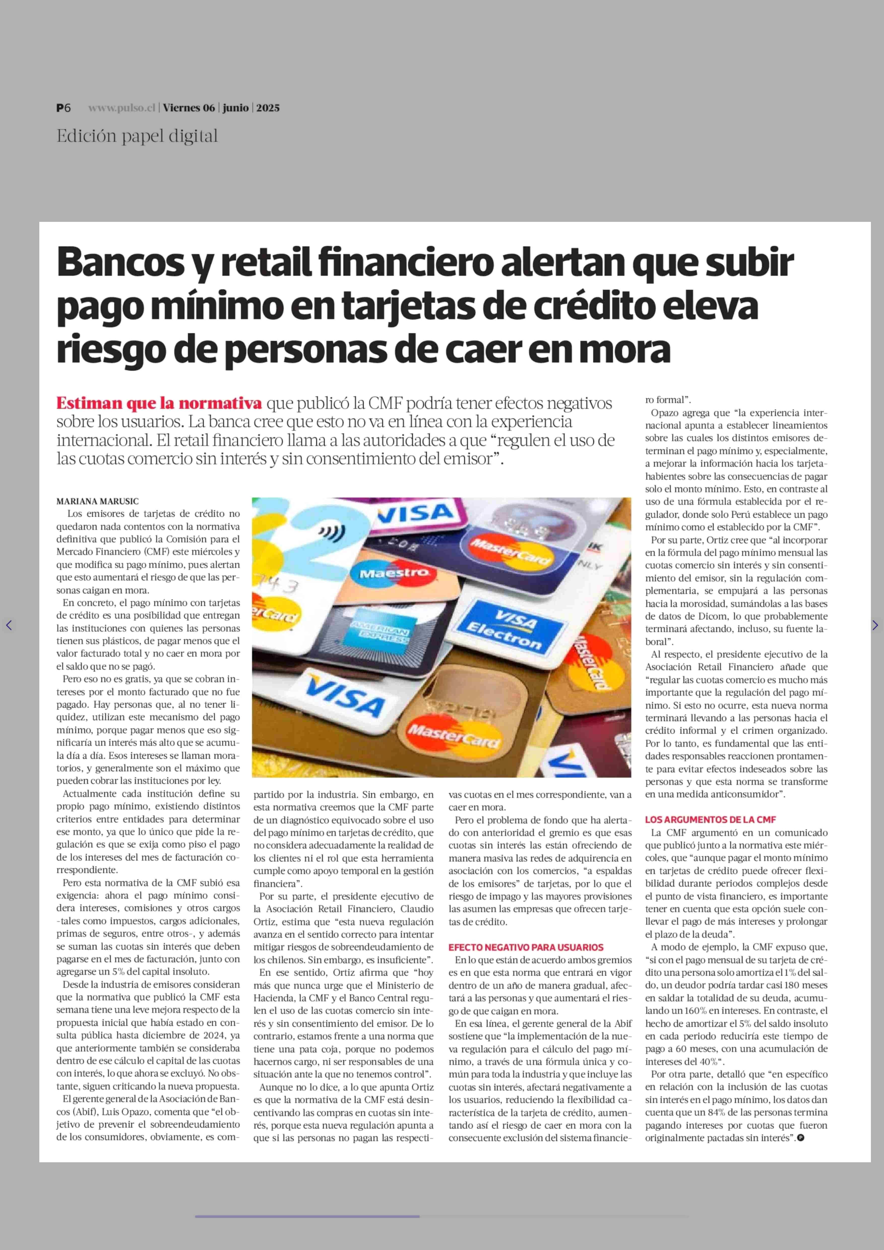 Bancos y retail financiero alertan que subir pago mínimo en tarjetas de crédito eleva riesgo de personas de caer en mora 06-06-2025 La Tercera |