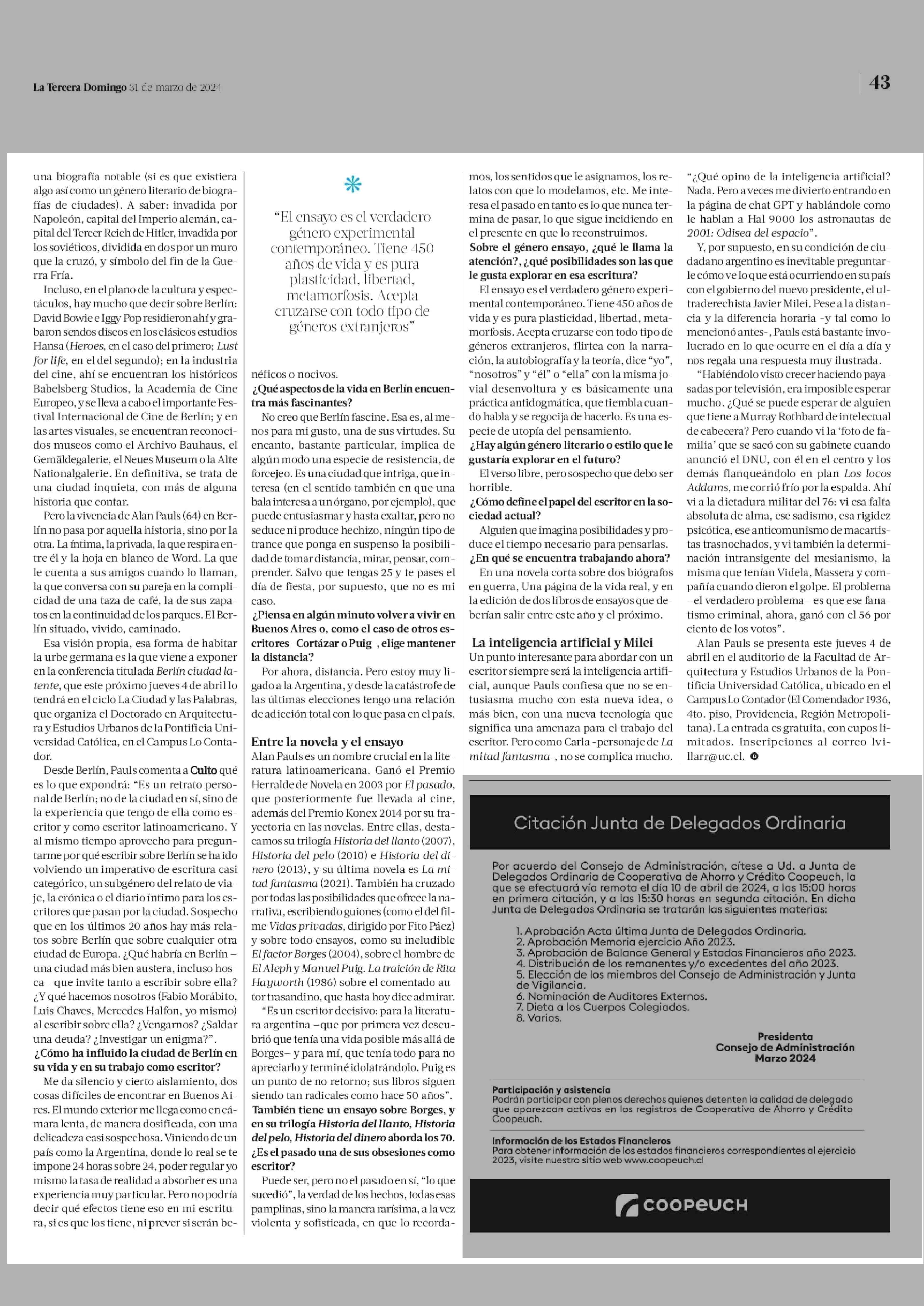 alan pauls “Desde la catástrofe de las últimas elecciones, tengo una relación de adicción total con lo que pasa en mi país” 31-03-2024 La Tercera |
