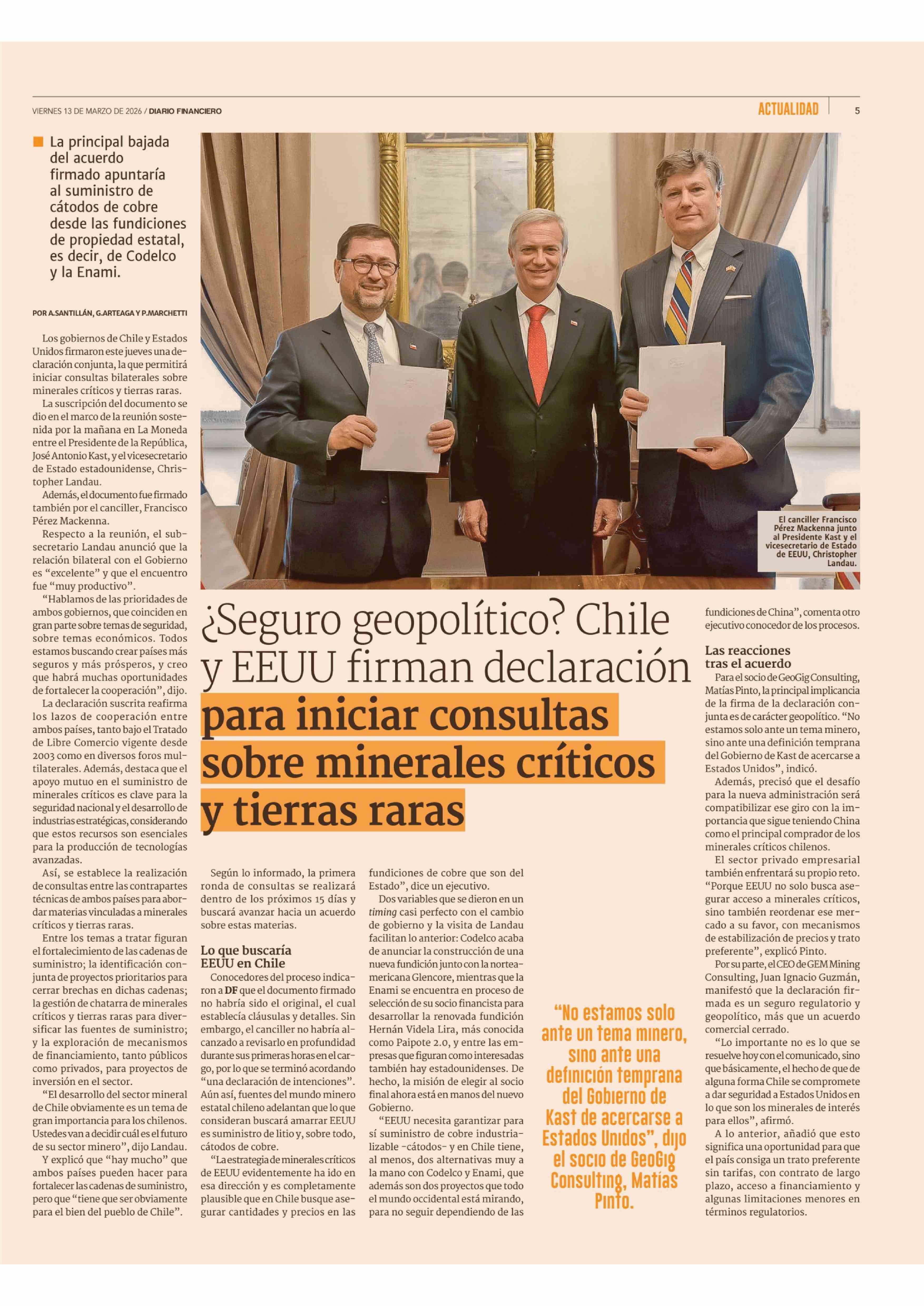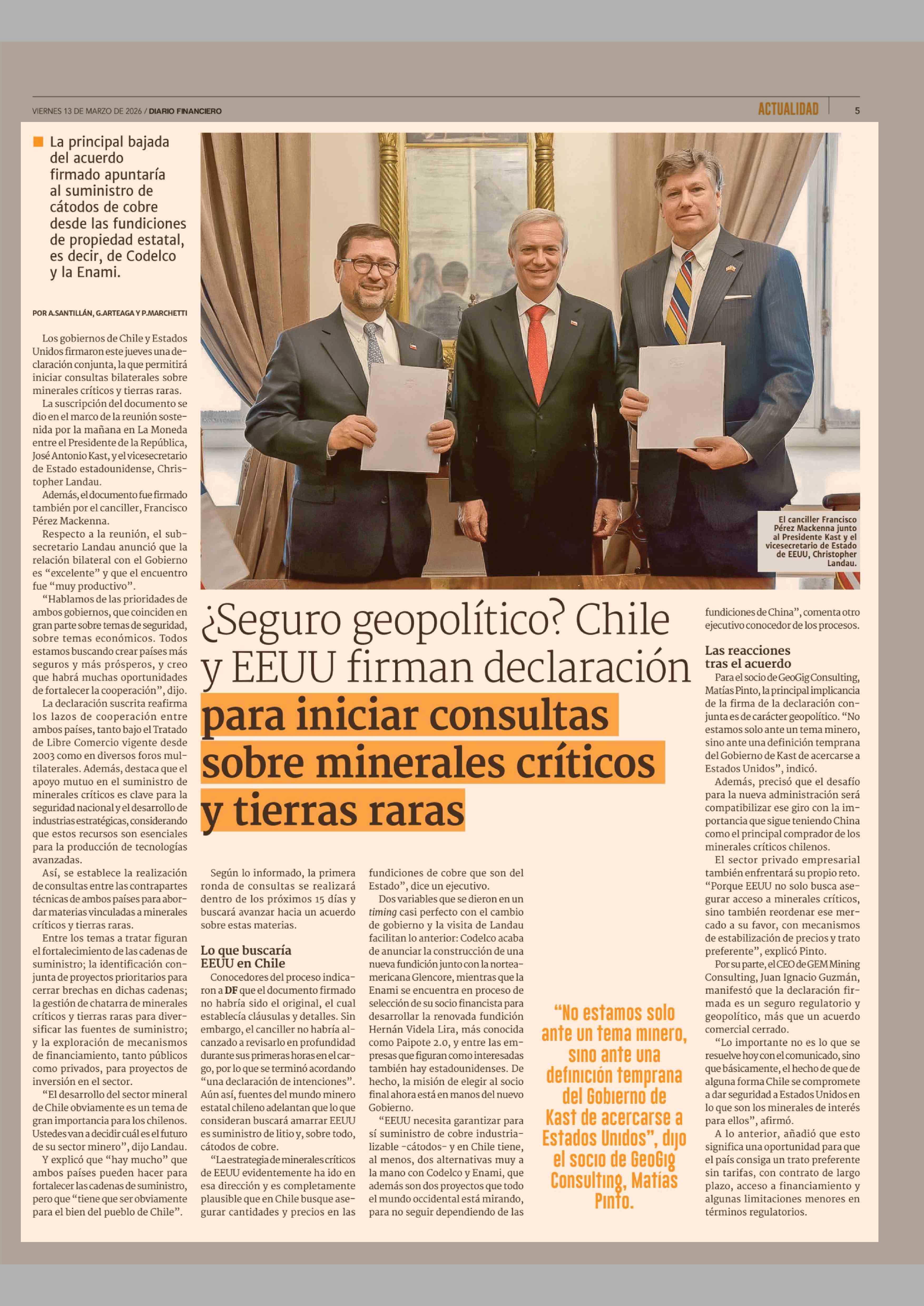 ¿Seguro geopolítico? Chile y EEUU firman declaración para iniciar consultas sobre minerales críticos y tierras raras 13-03-2026 Diario Financiero |