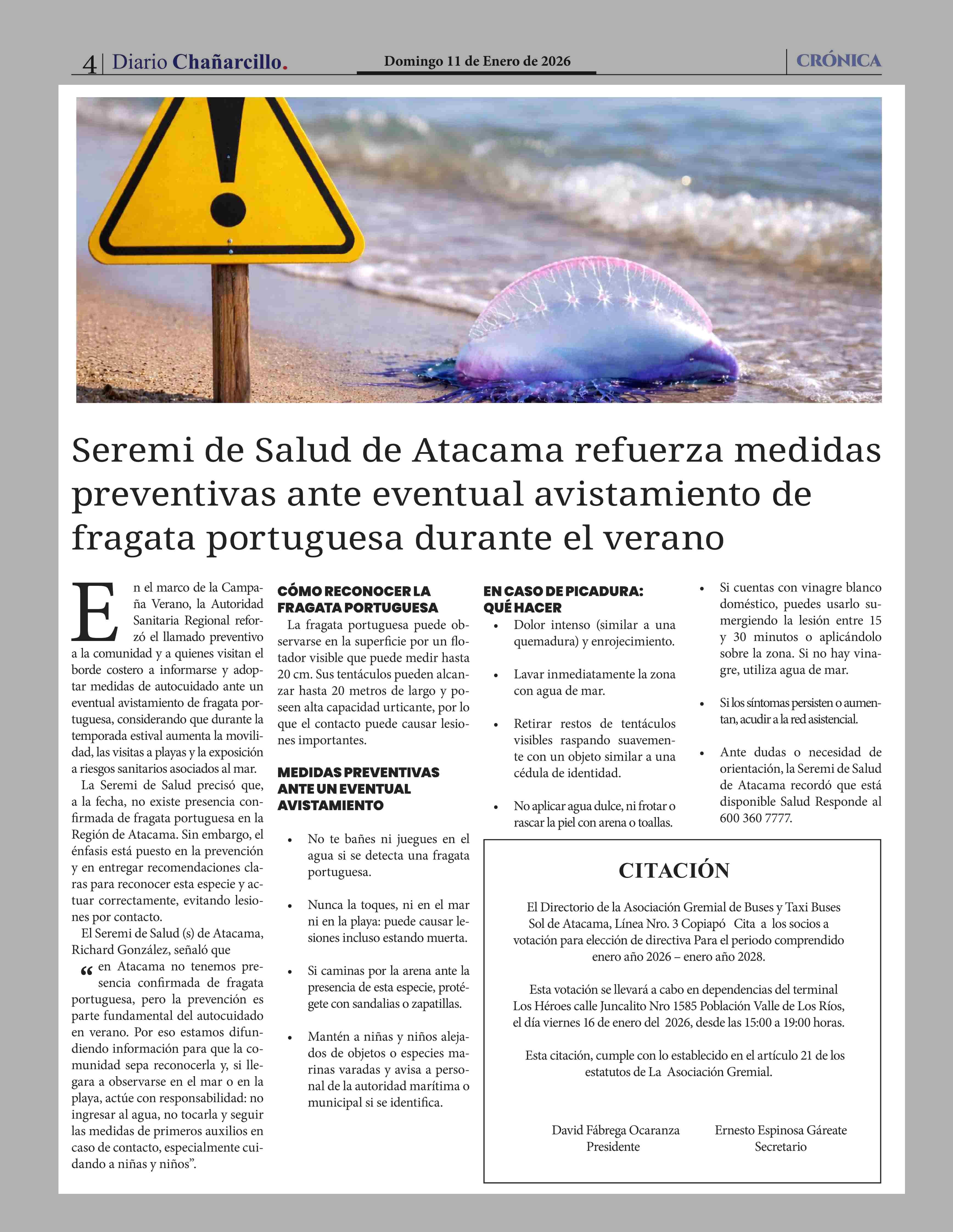 Título: Seremi de Salud de Atacama refuerza medidas preventivas ante eventual avistamiento de fragata portuguesa durante el verano