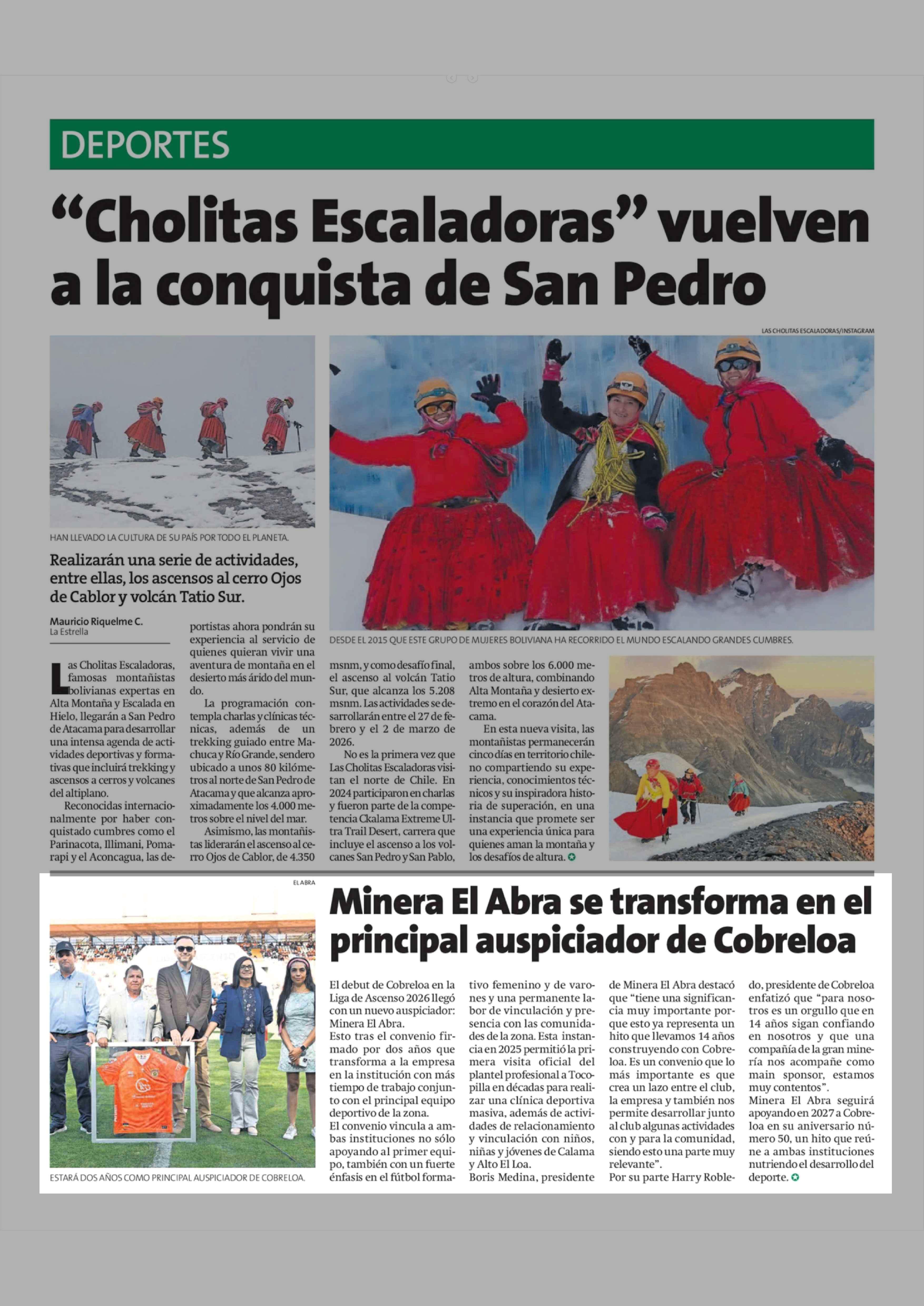 Minera El Abra se transforma en el principal auspiciador de Cobreloa 26-02-2026 La Estrella de Antofagasta |