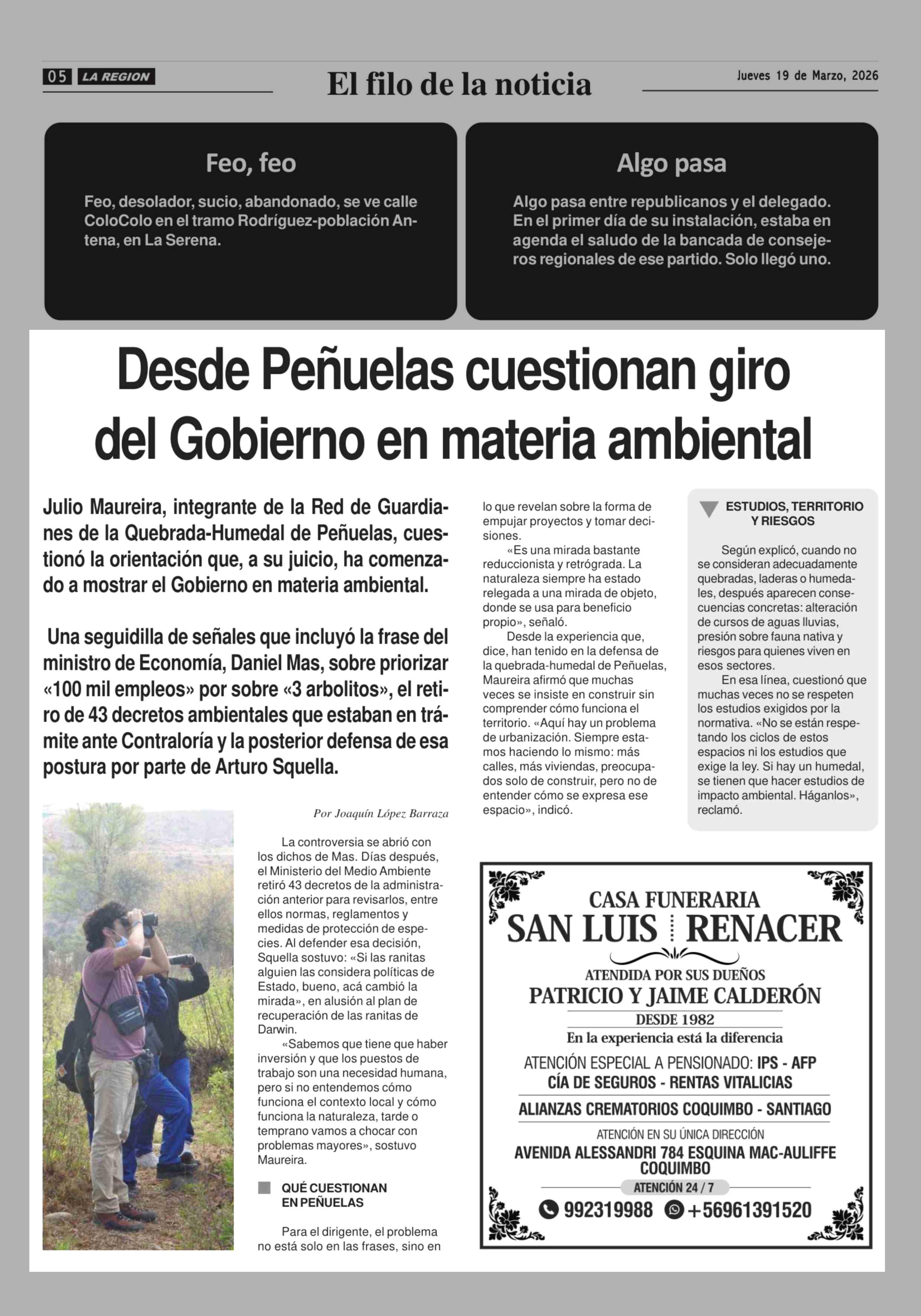 Desde Peñuelas cuestionan giro del Gobierno en materia ambiental 19-03-2026 Diario la Región |