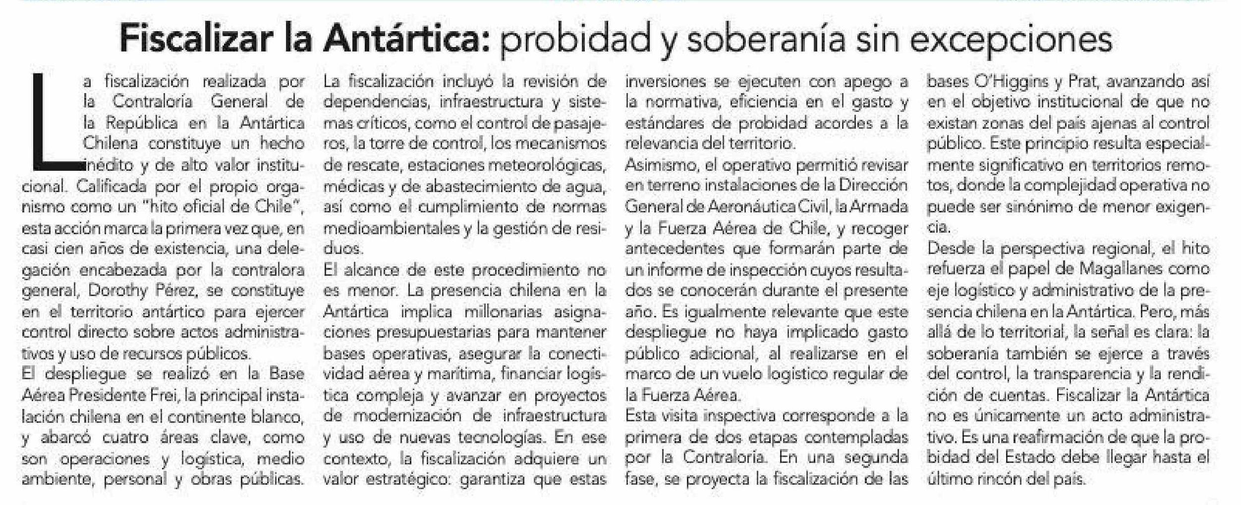 Editorial: Fiscalizar la Antártica: probidad y soberanía sin excepciones 13-01-2026 La Prensa Austral |