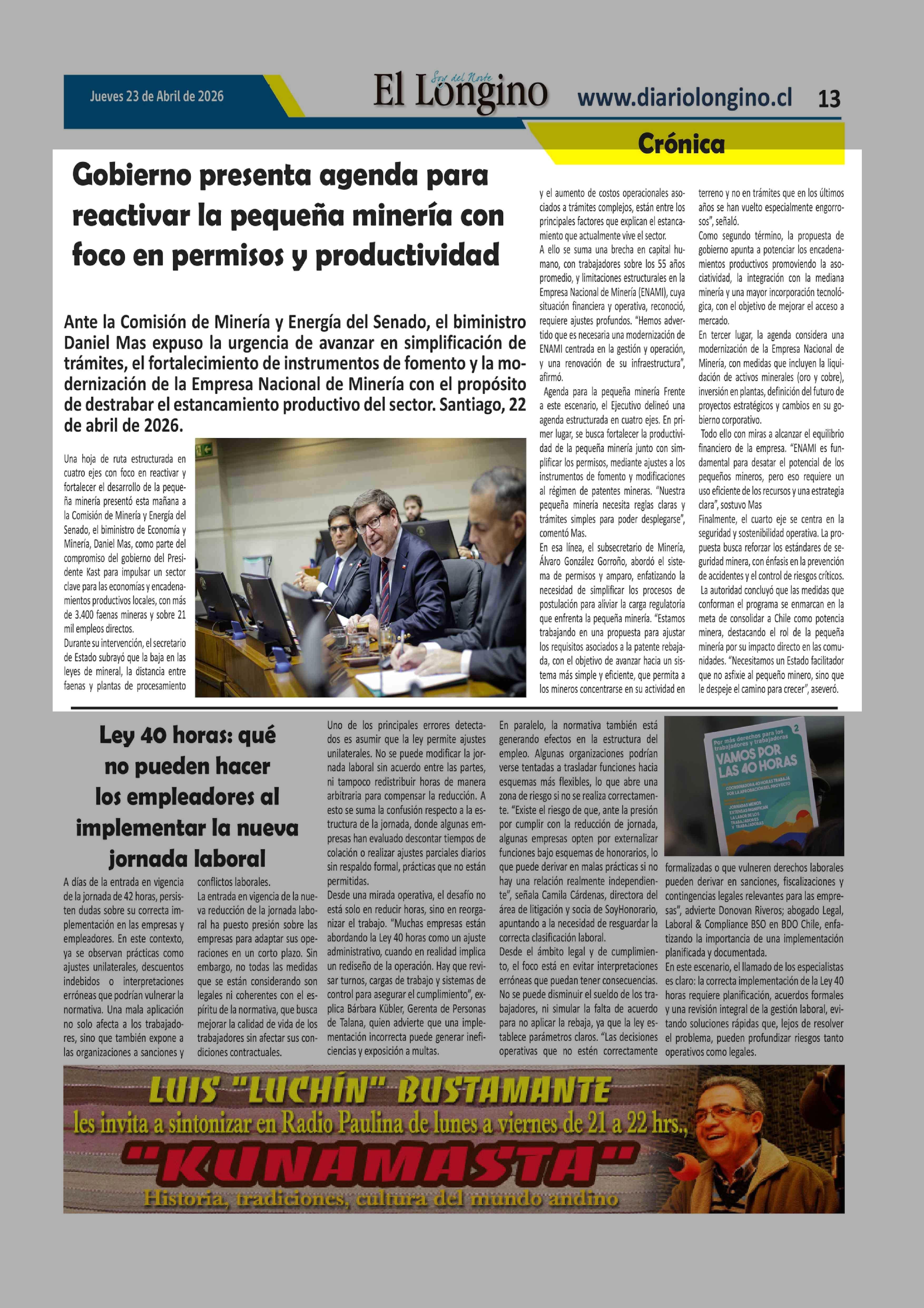 Gobierno presenta agenda para reactivar la pequeña minería con foco en permisos y productividad 23-04-2026 El Longino |