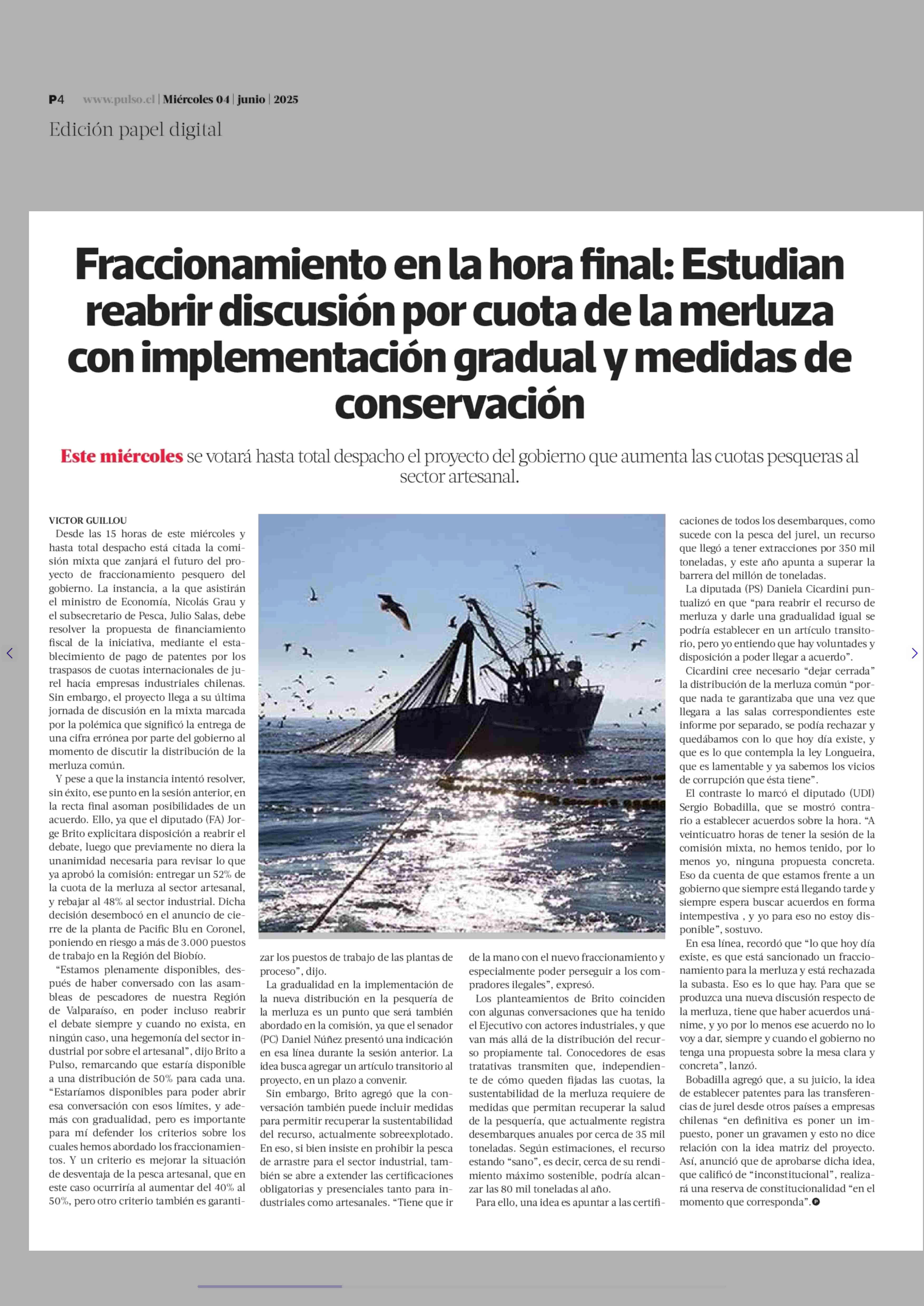 Fraccionamiento en la hora final: Estudian reabrir discusión por cuota de la merluza con implementación gradual y medidas de conservación 04-06-2025 La Tercera |