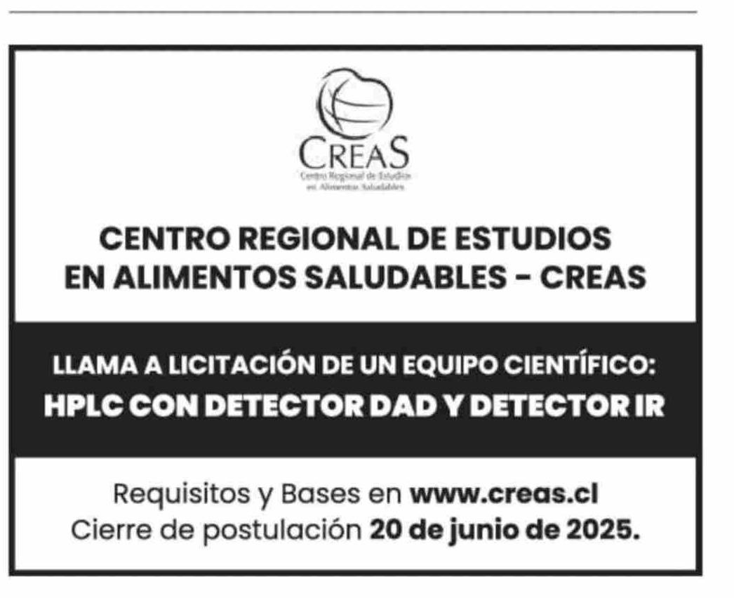 AVISO LICITACIONES: CENTRO REGIONAL DE ESTUDIOS EN ALIMENTOS SALUDABLES - CREAS 06-06-2025 La Tercera |