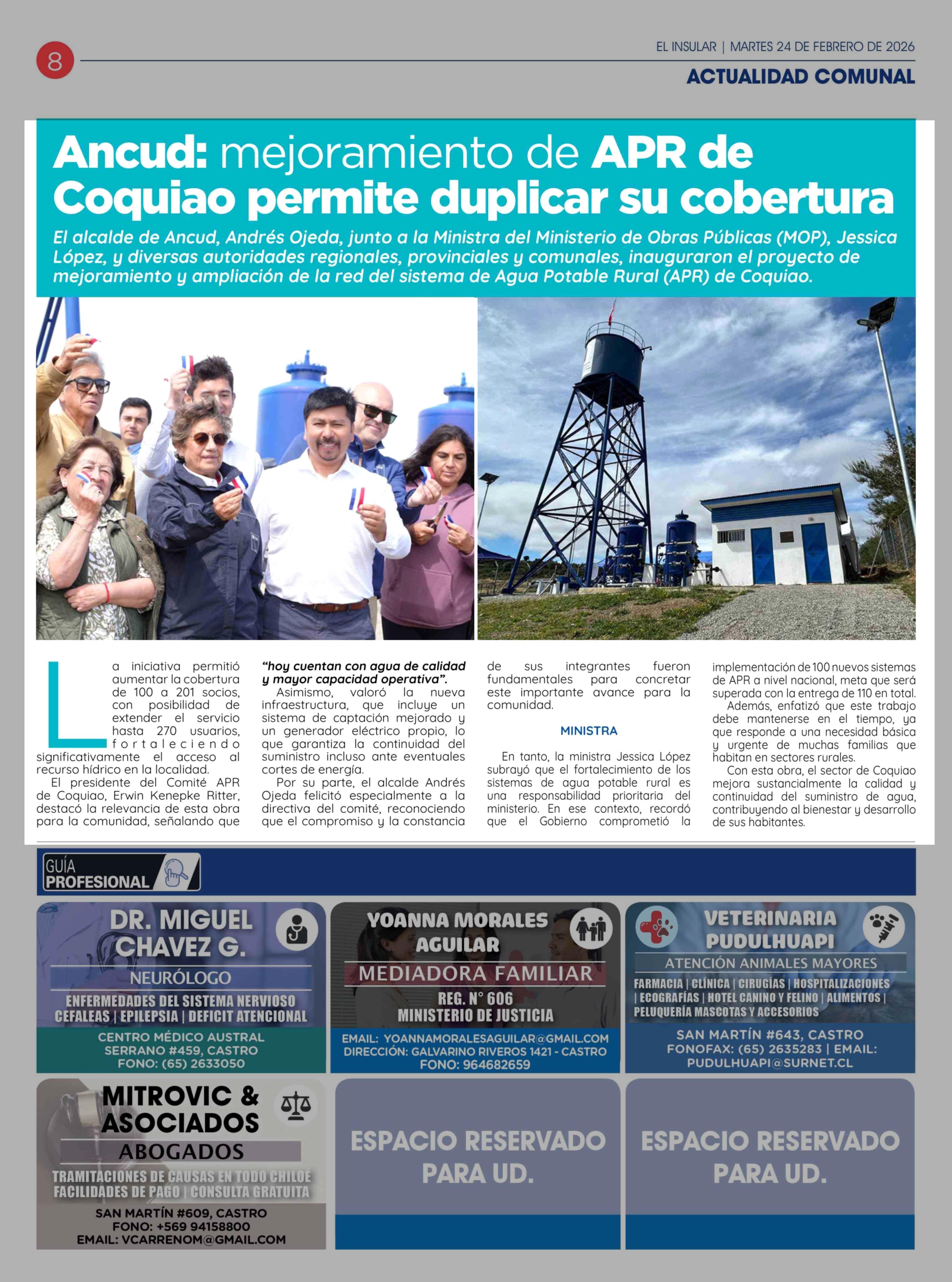 Ancud: mejoramiento de APR de Coquiao permite duplicar su cobertura 24-02-2026 El Insular |