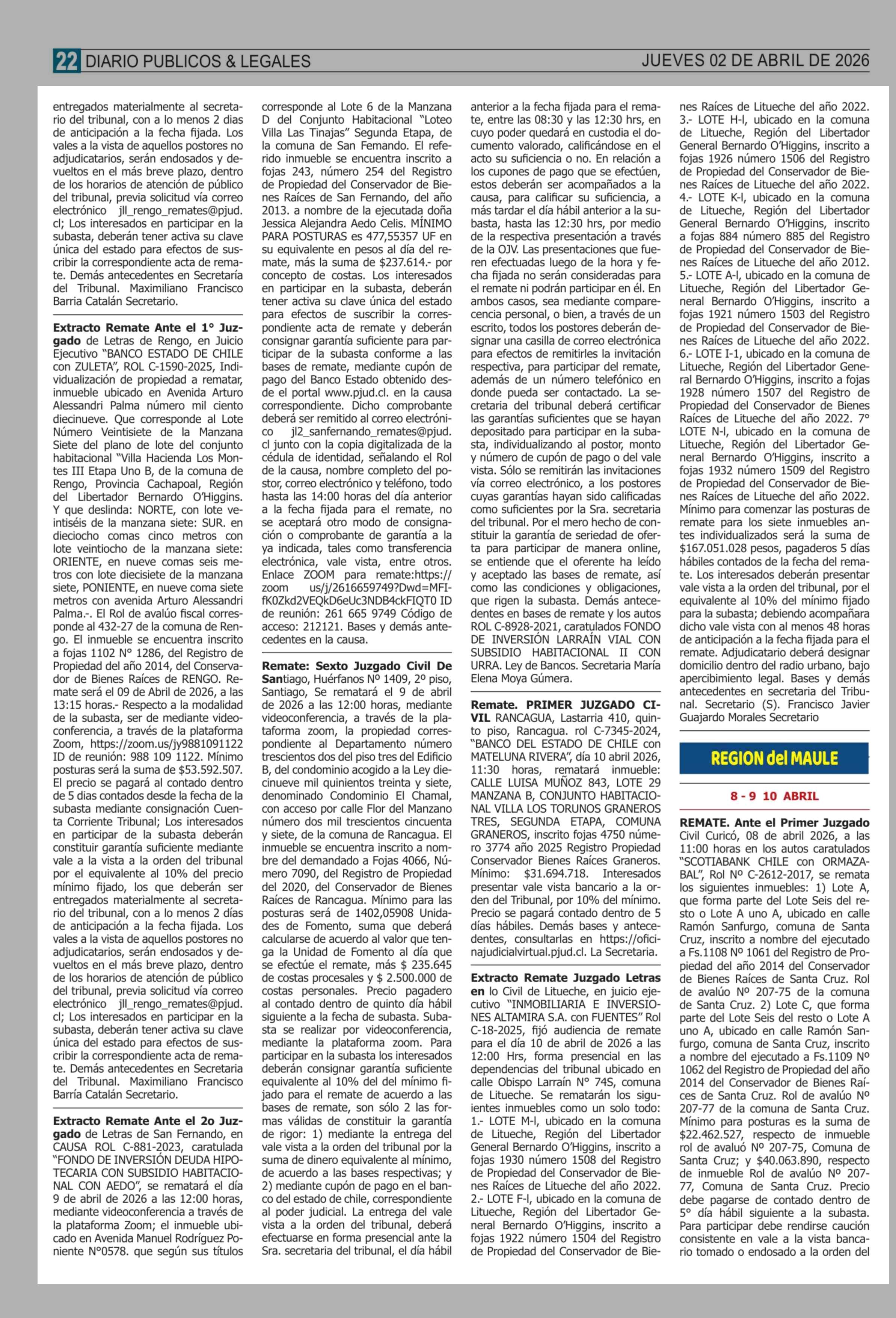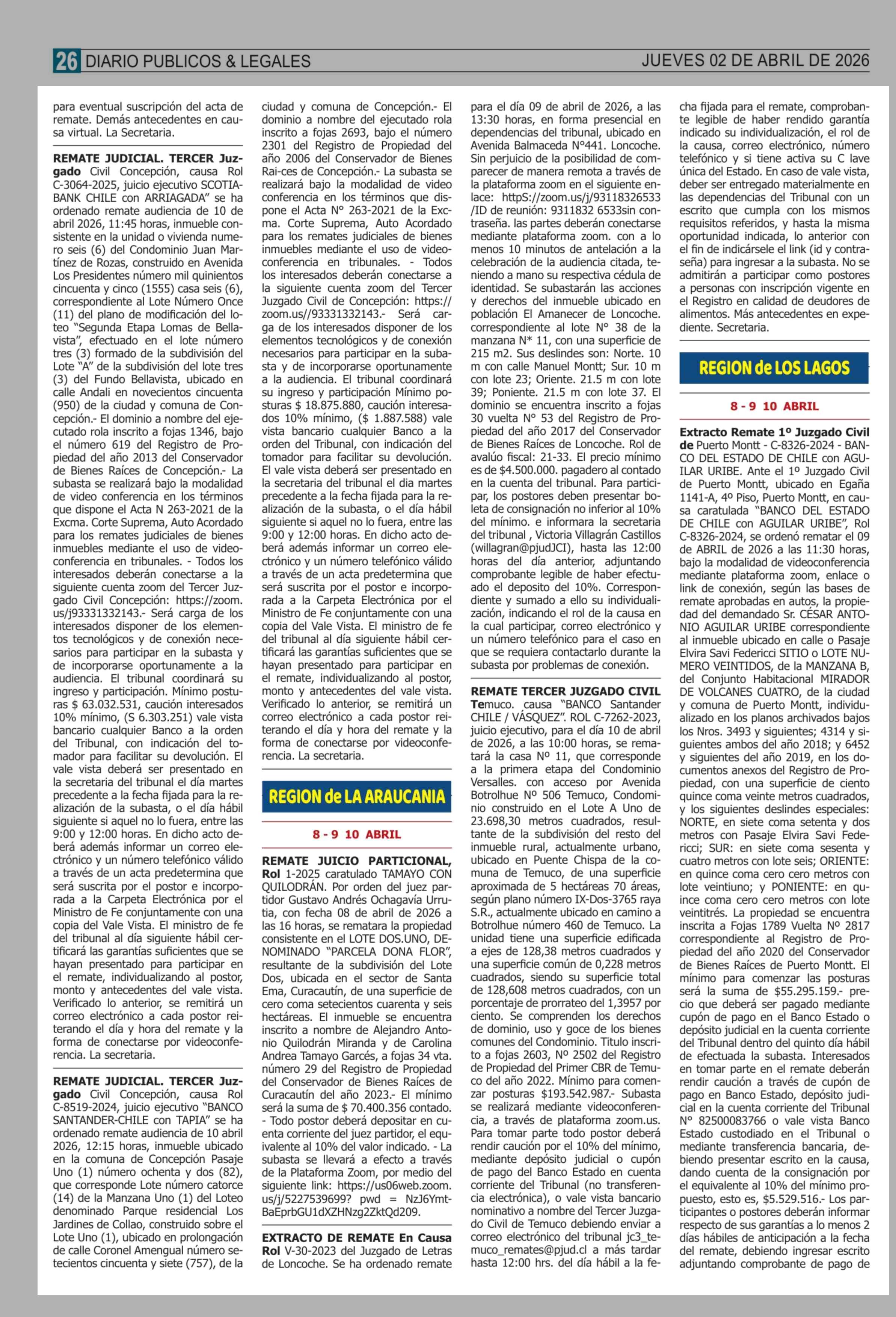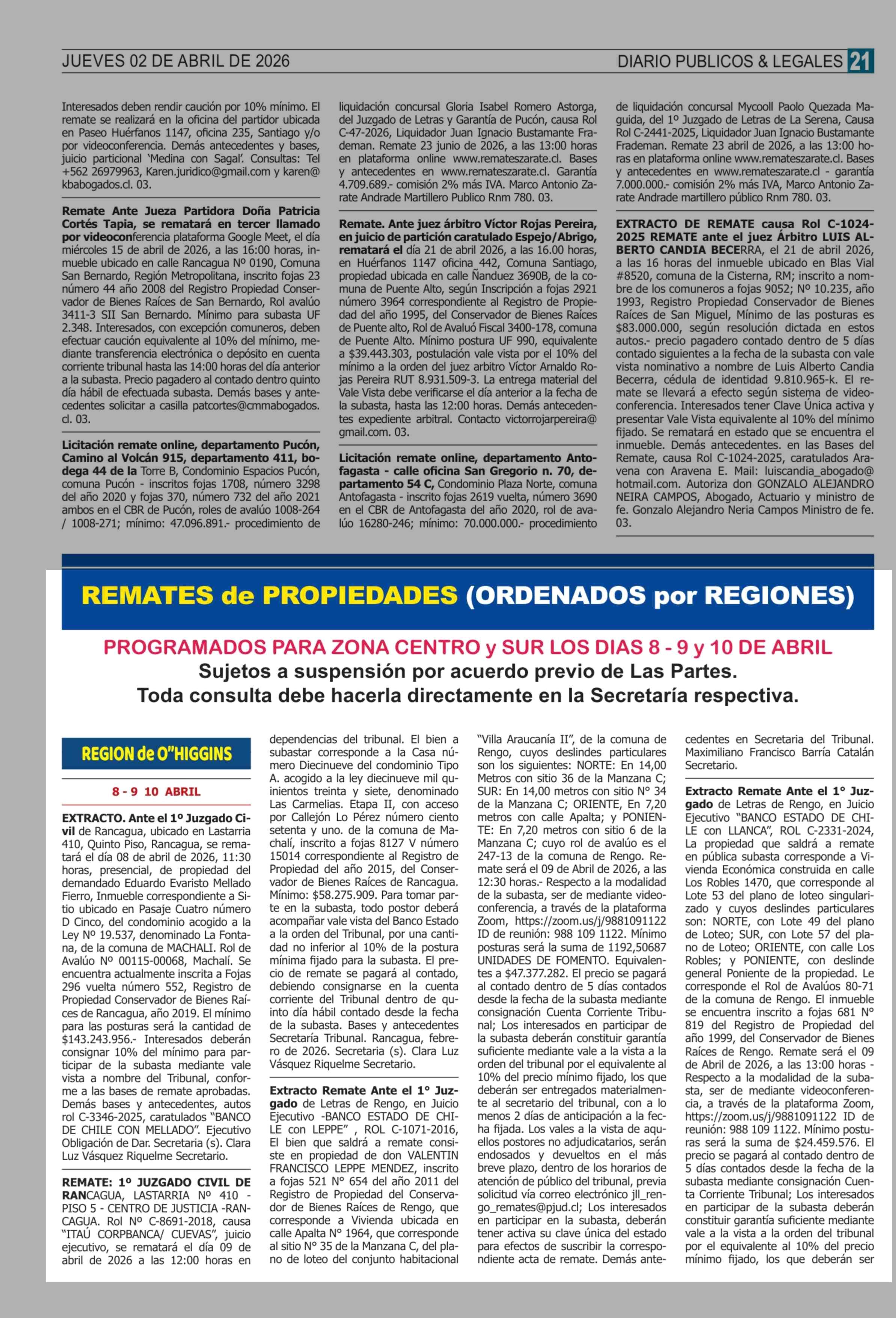 Remates: REMATES de PROPIEDADES (ORDENADOS por REGIONES) 02-04-2026 P&L Públicos y Legales |
