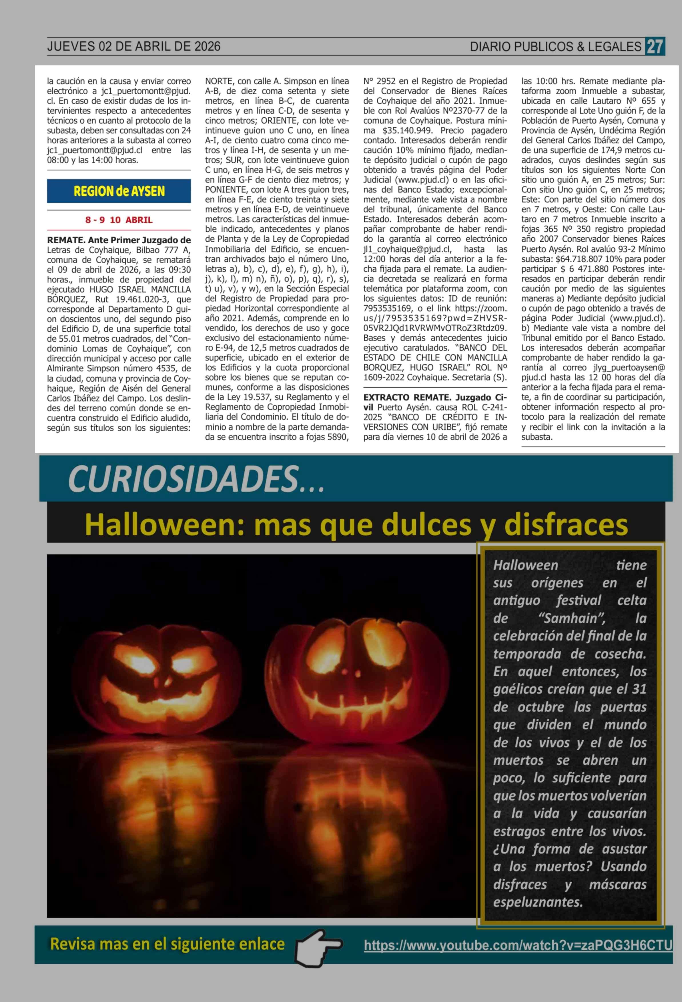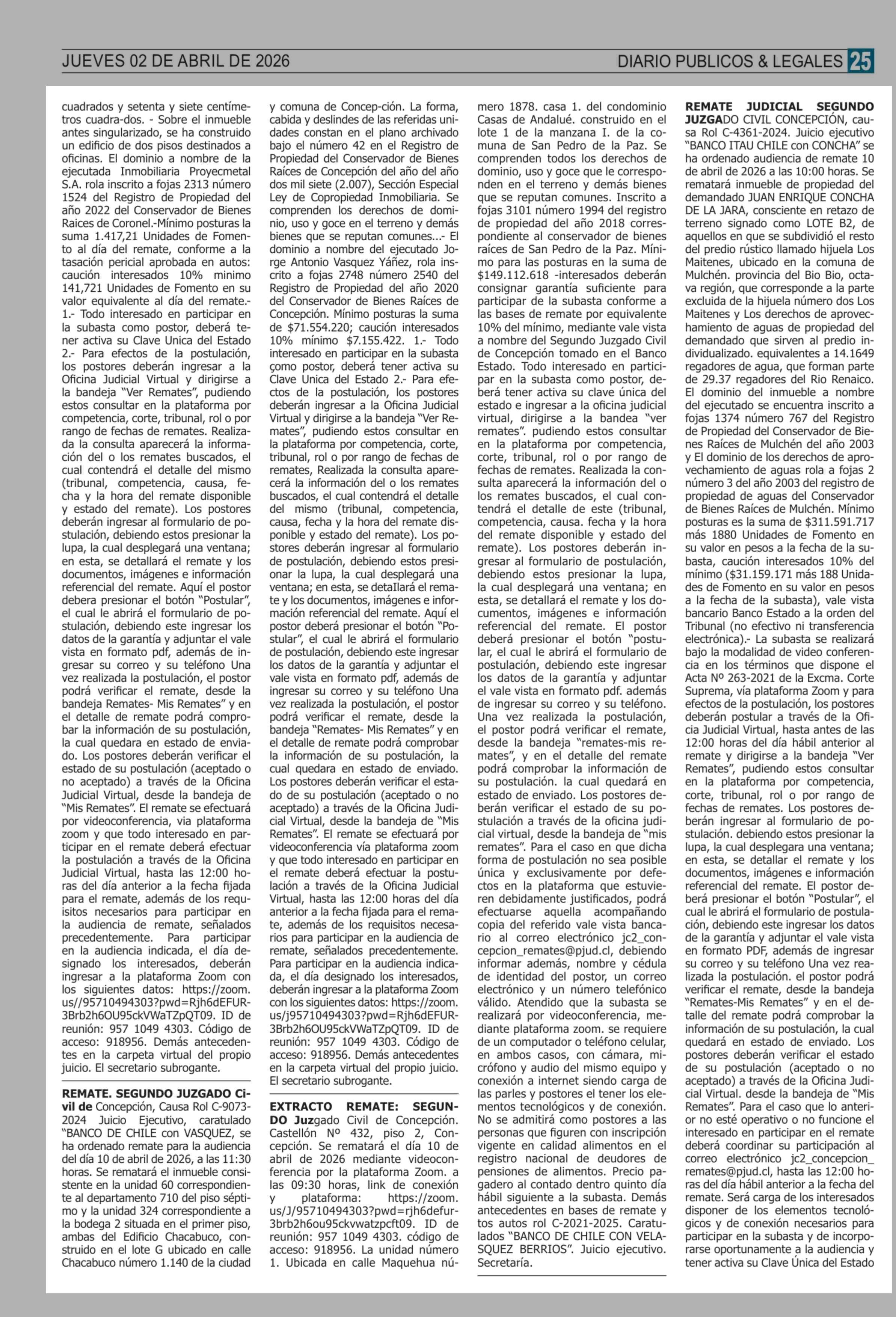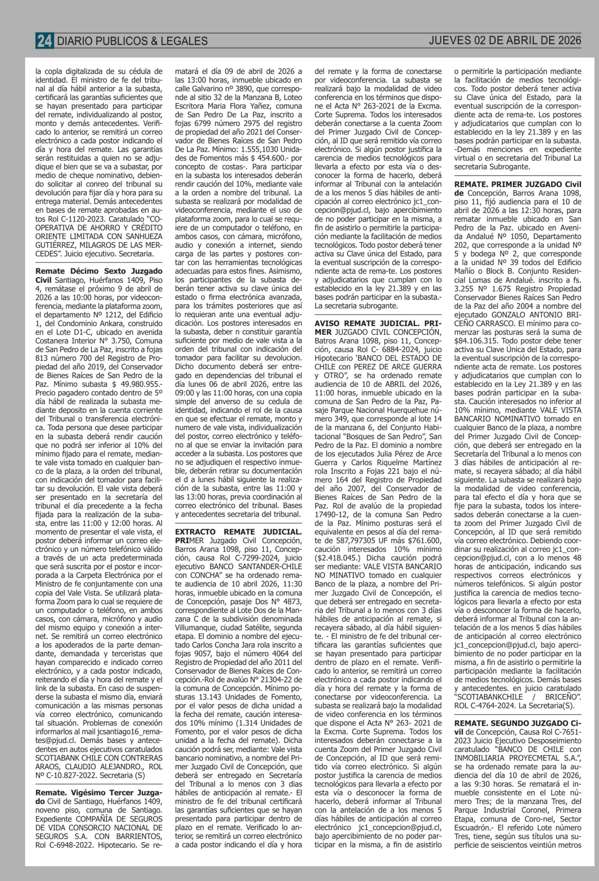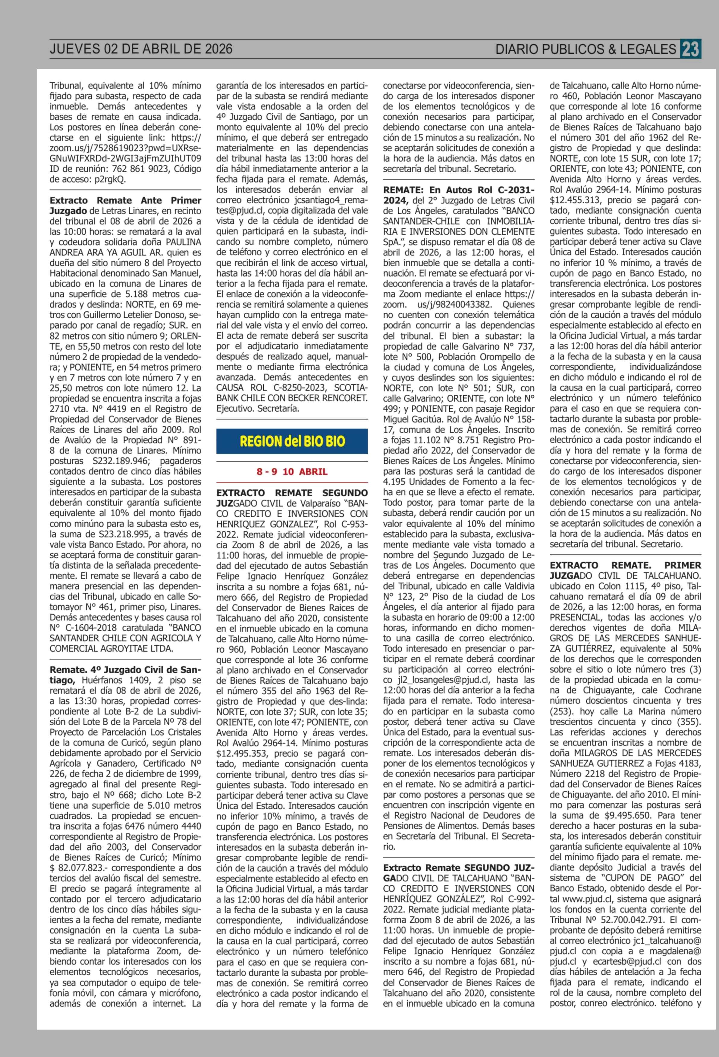 Remates: REMATES de PROPIEDADES (ORDENADOS por REGIONES) 02-04-2026 P&L Públicos y Legales |