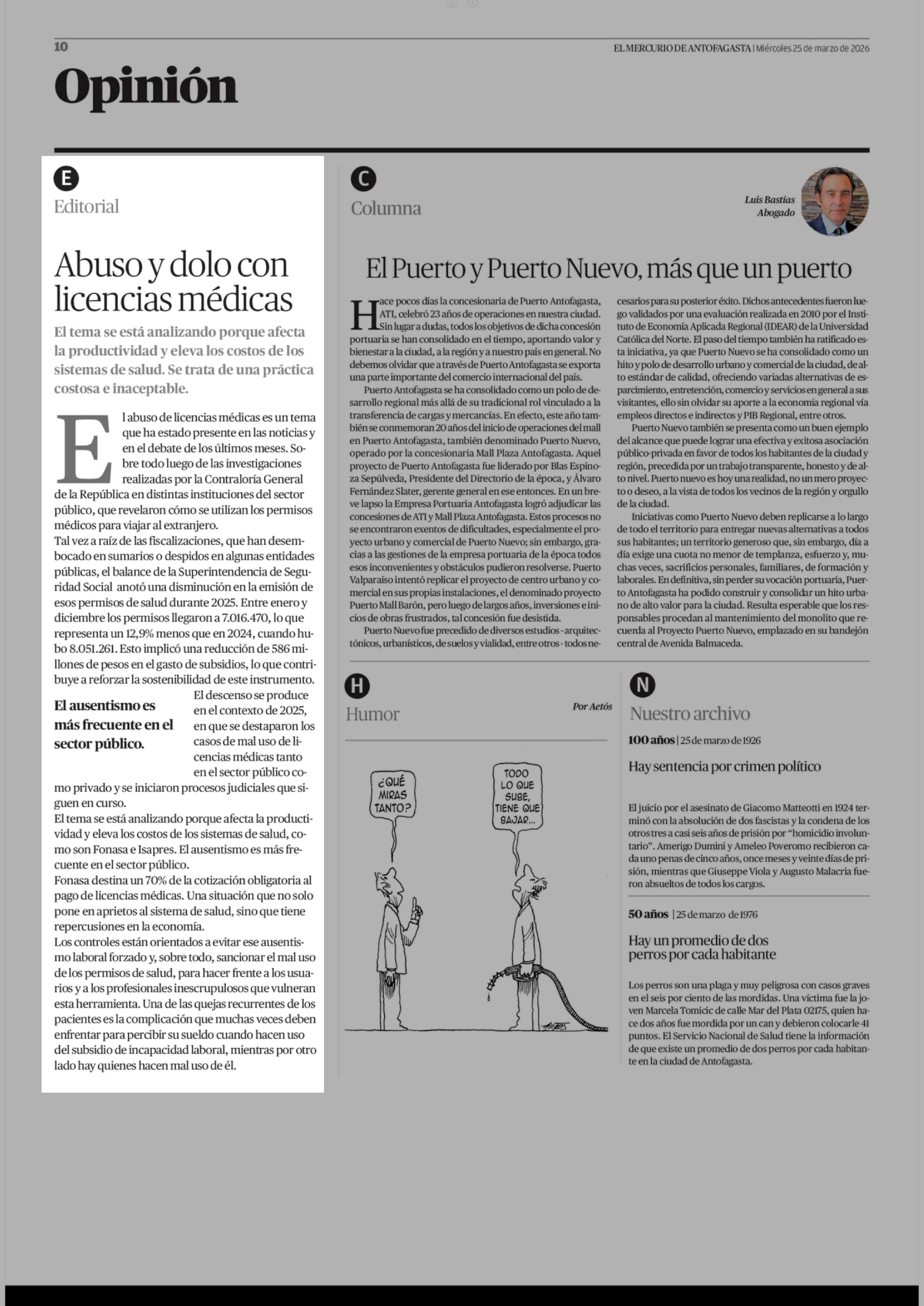 Editorial: Abuso y dolo con licencias médicas 25-03-2026 El Mercurio de Antofagasta |