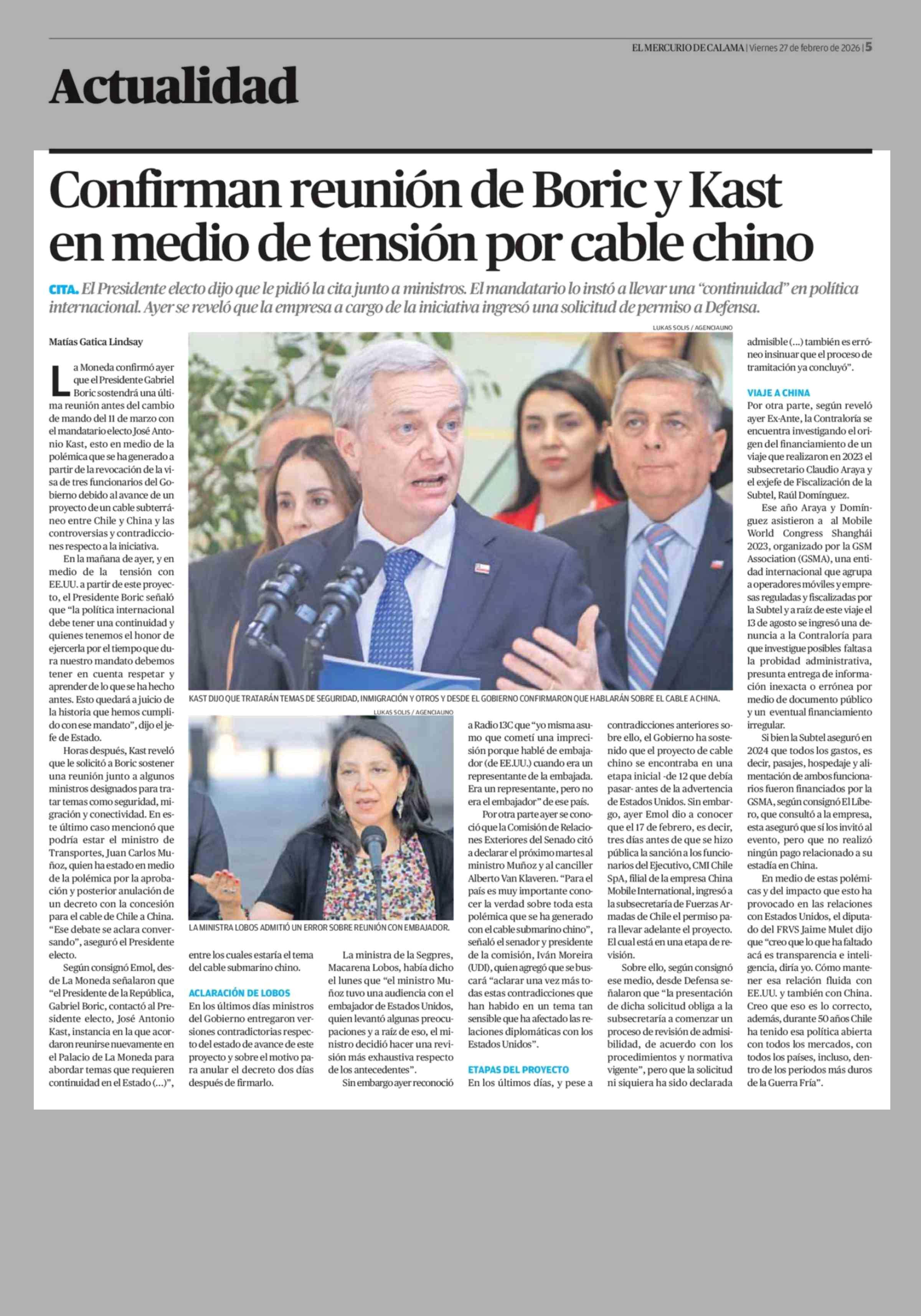 Confirman reunión de Boric y Kast en medio de tensión por cable chino 27-02-2026 El Mercurio de Calama |