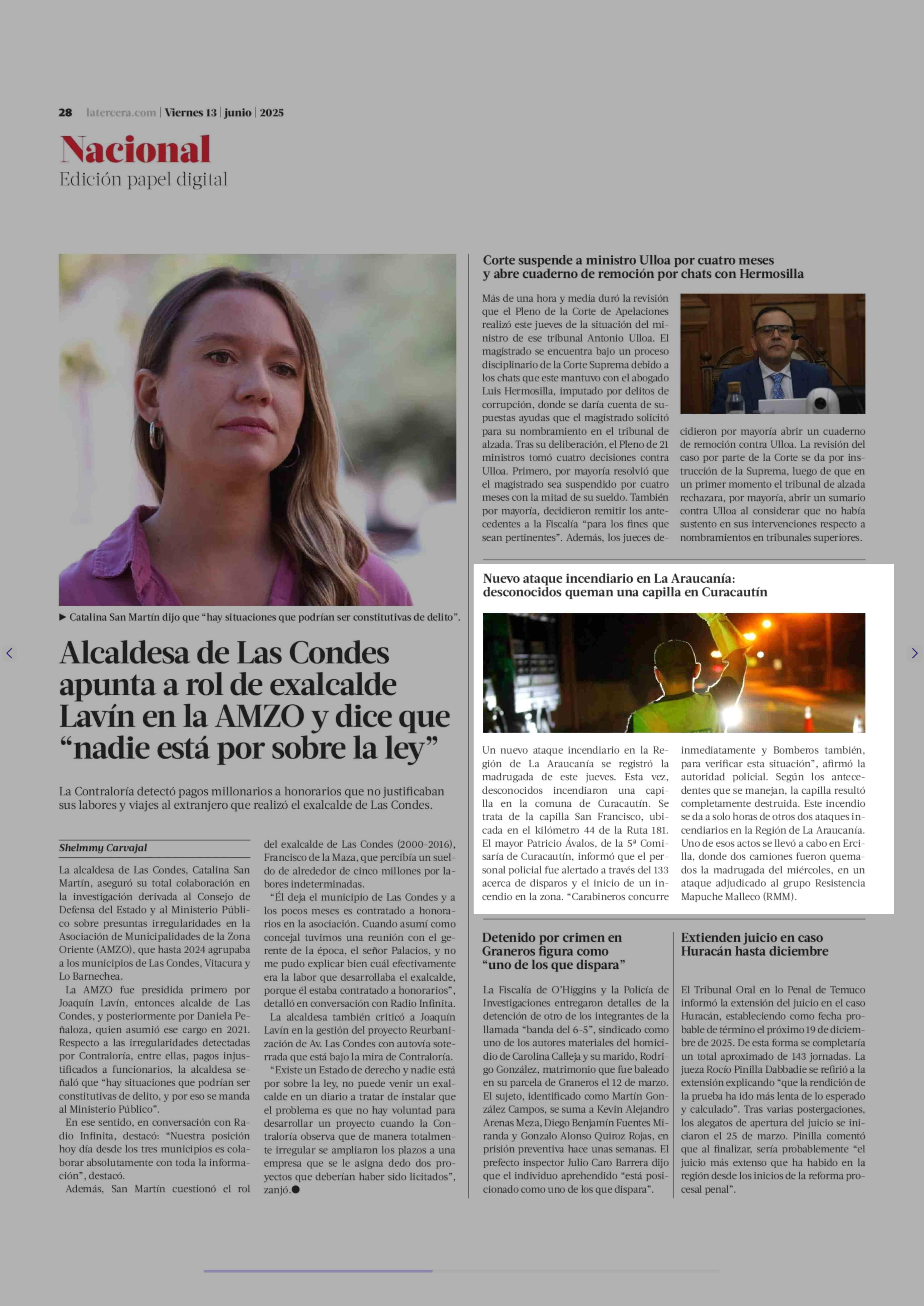 Nuevo ataque incendiario en La Araucanía: desconocidos queman una capilla en Curacautín 13-06-2025 La Tercera |