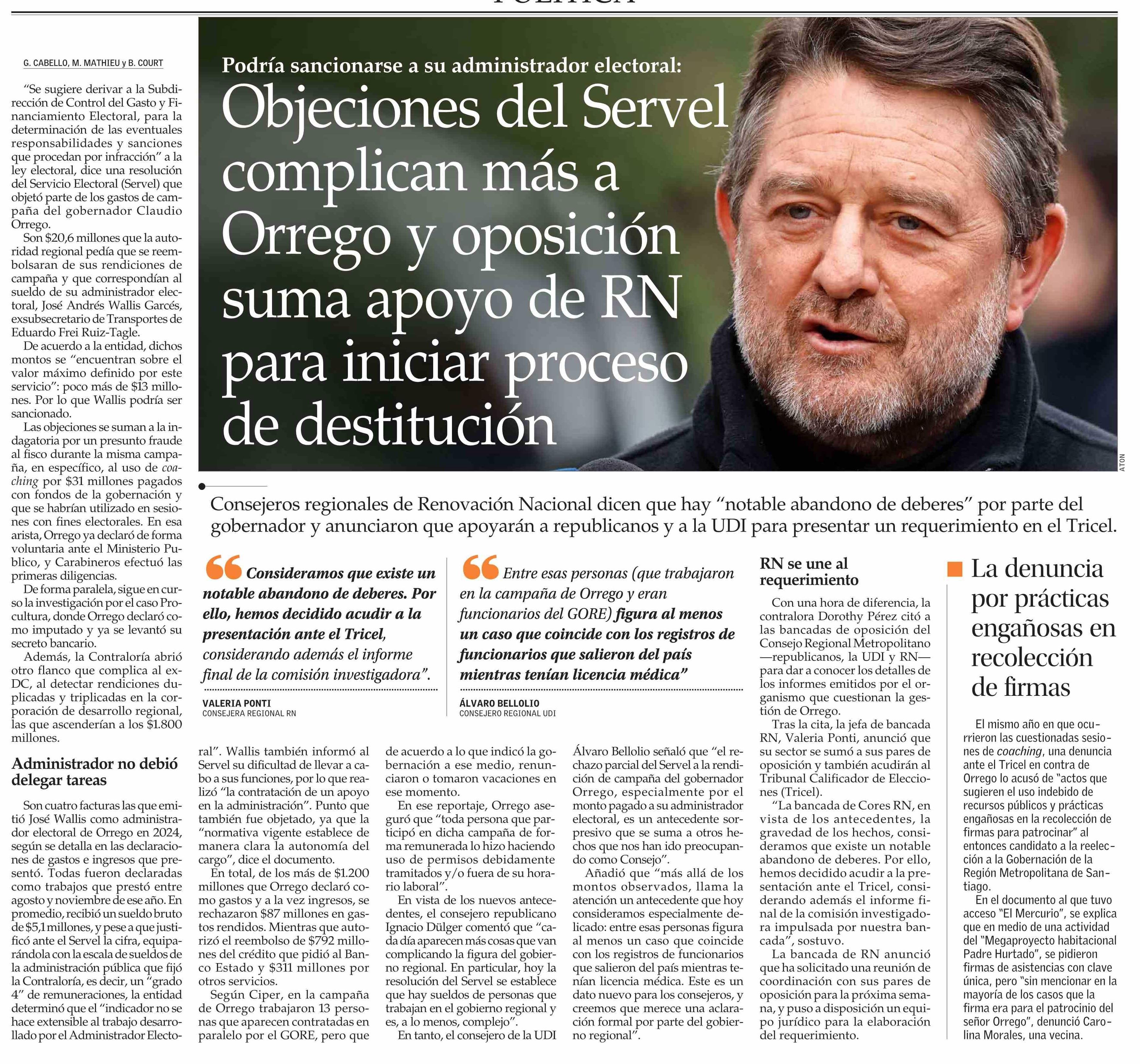 Objeciones del Servel complican más a Orrego y oposición suma apoyo de RN para iniciar proceso de destitución 20-06-2025 El Mercurio |