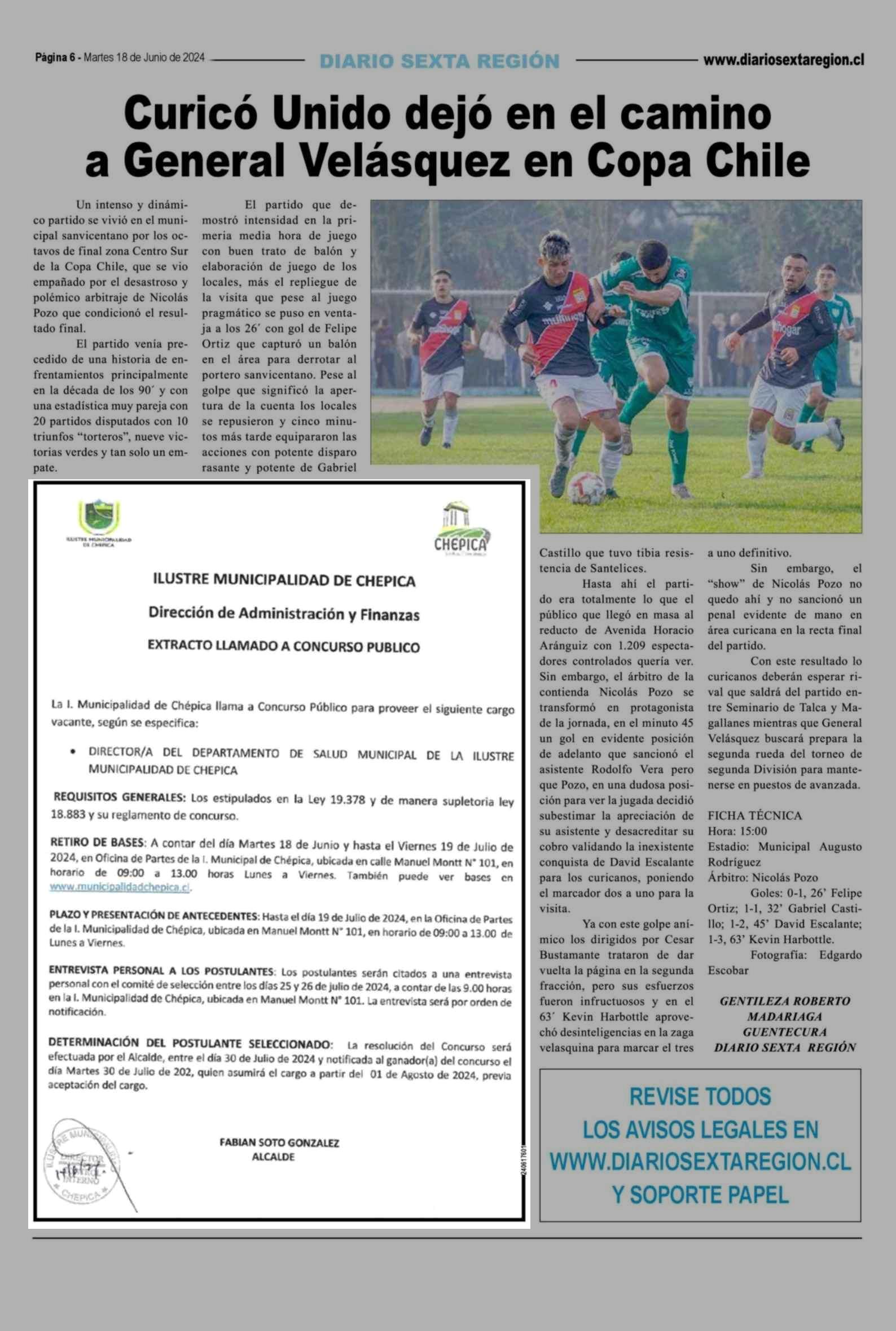 AVISO LICITACIONES: ILUSTRE MUNICIPALIDAD DE CHEPICA 18-06-2024 Diario VI Región |