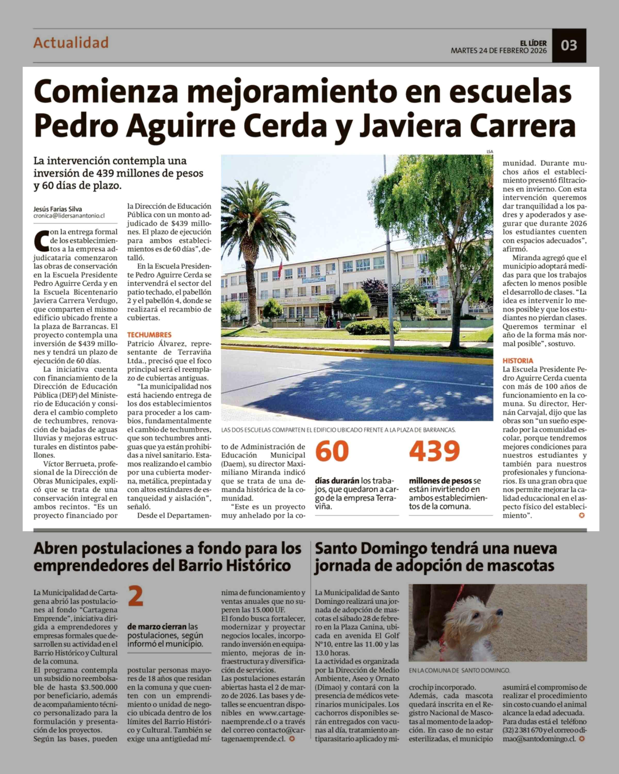 Comienza mejoramiento en escuelas Pedro Aguirre Cerda y Javiera Carrera 24-02-2026 El Líder |