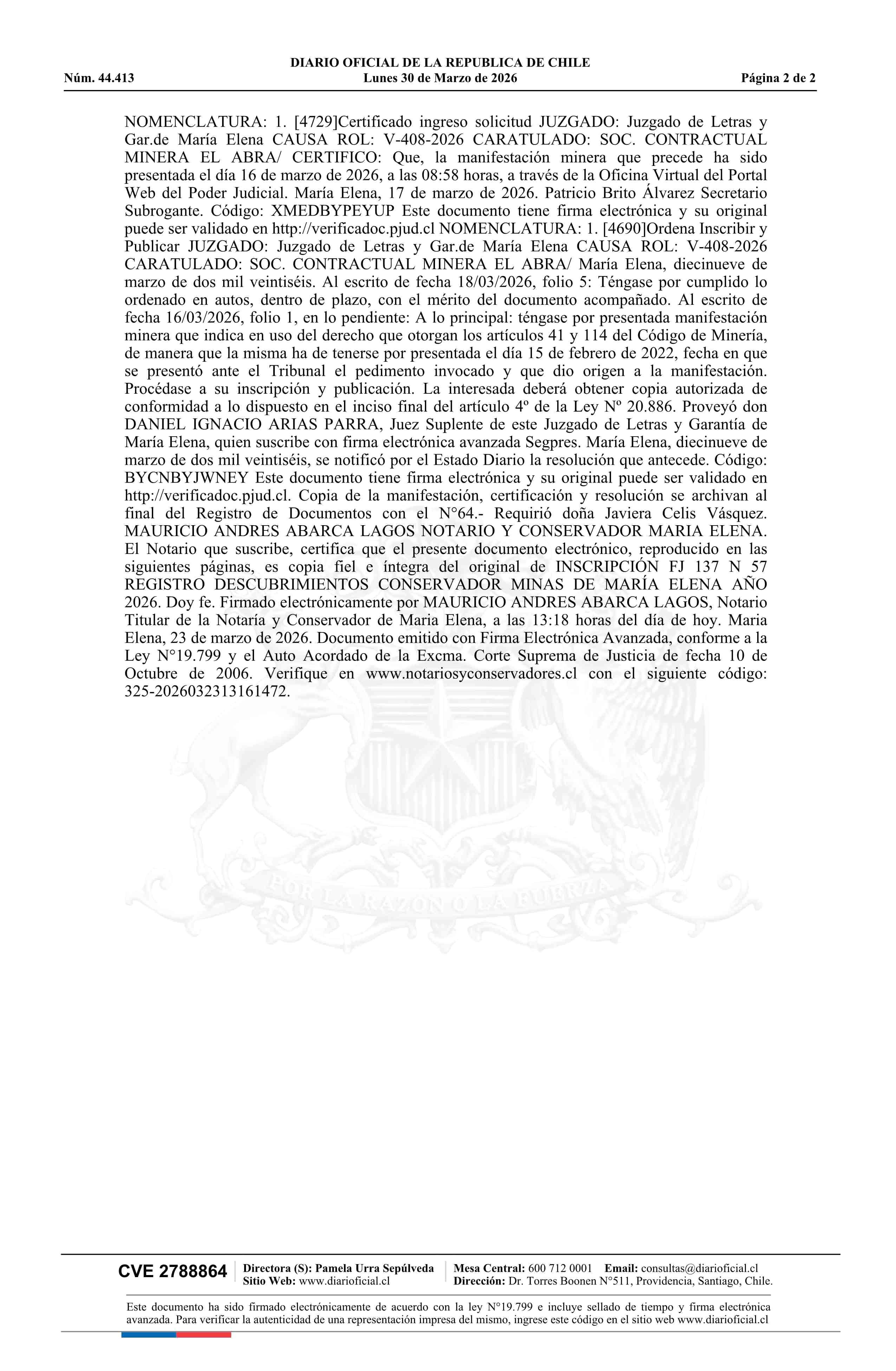 ABRAN B21 1/40 / SCM El Abra 30-03-2026 DIARIO OFICIAL CHILE - BOLETÍN OFICIAL DE MINERÍA |