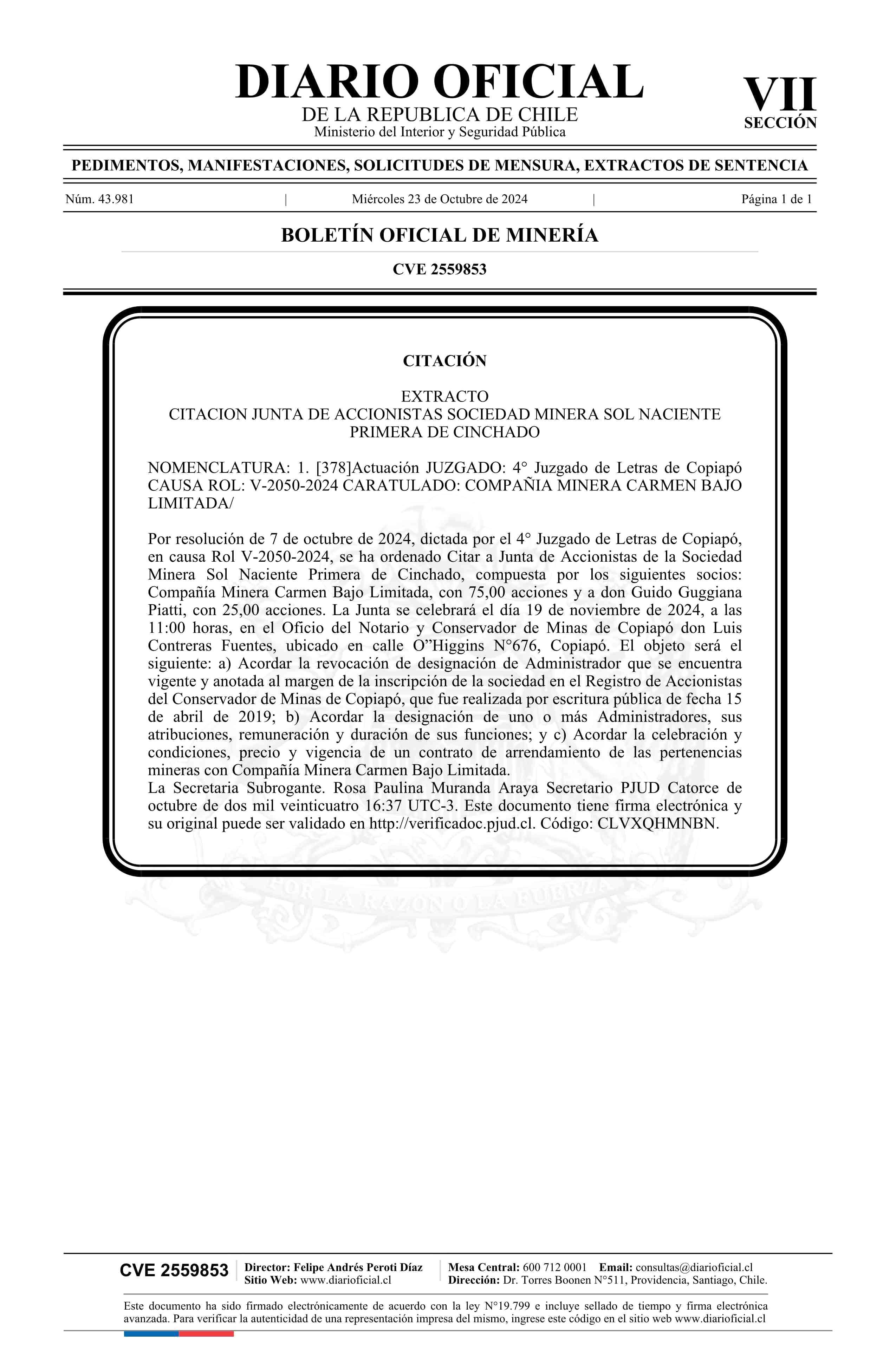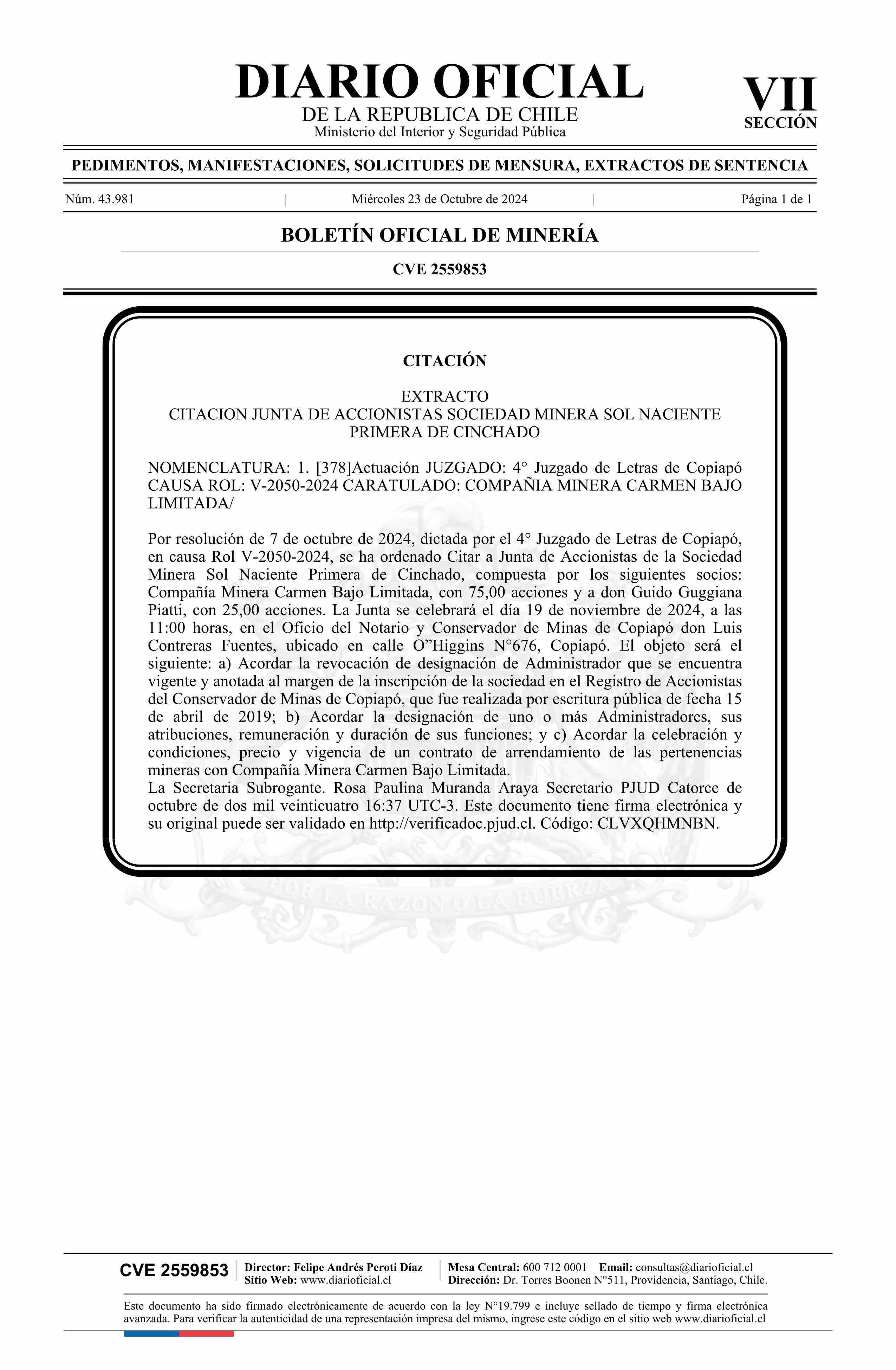 Sociedad Minera Sol Naciente Primera de Cinchado 23-10-2024 DIARIO OFICIAL CHILE - BOLETÍN OFICIAL DE MINERÍA |