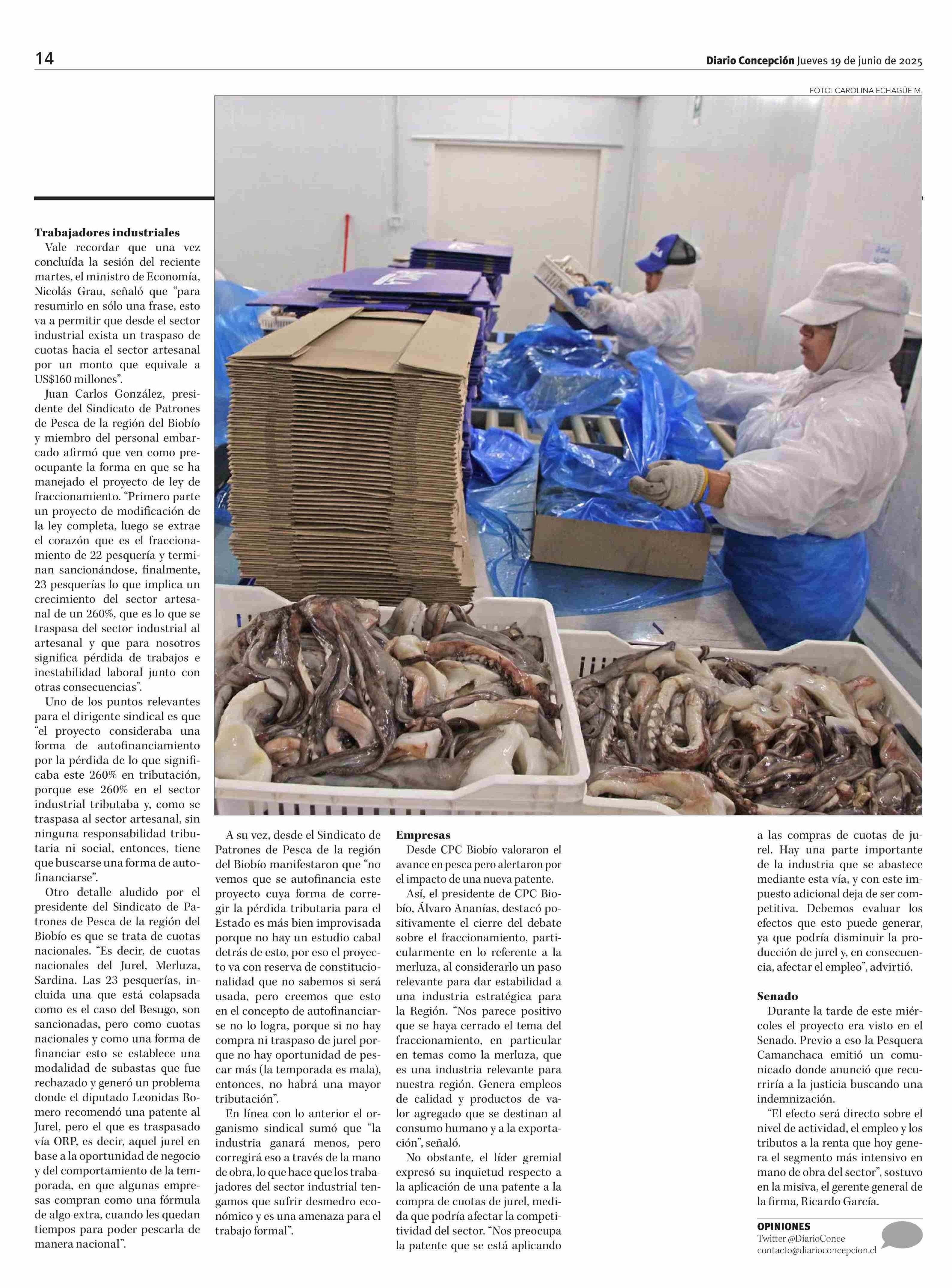 Fraccionamiento Pesquero: artesanales valoran nueva distribución de cuotas y trabajadores industriales prevén despidos 19-06-2025 Diario Concepción |