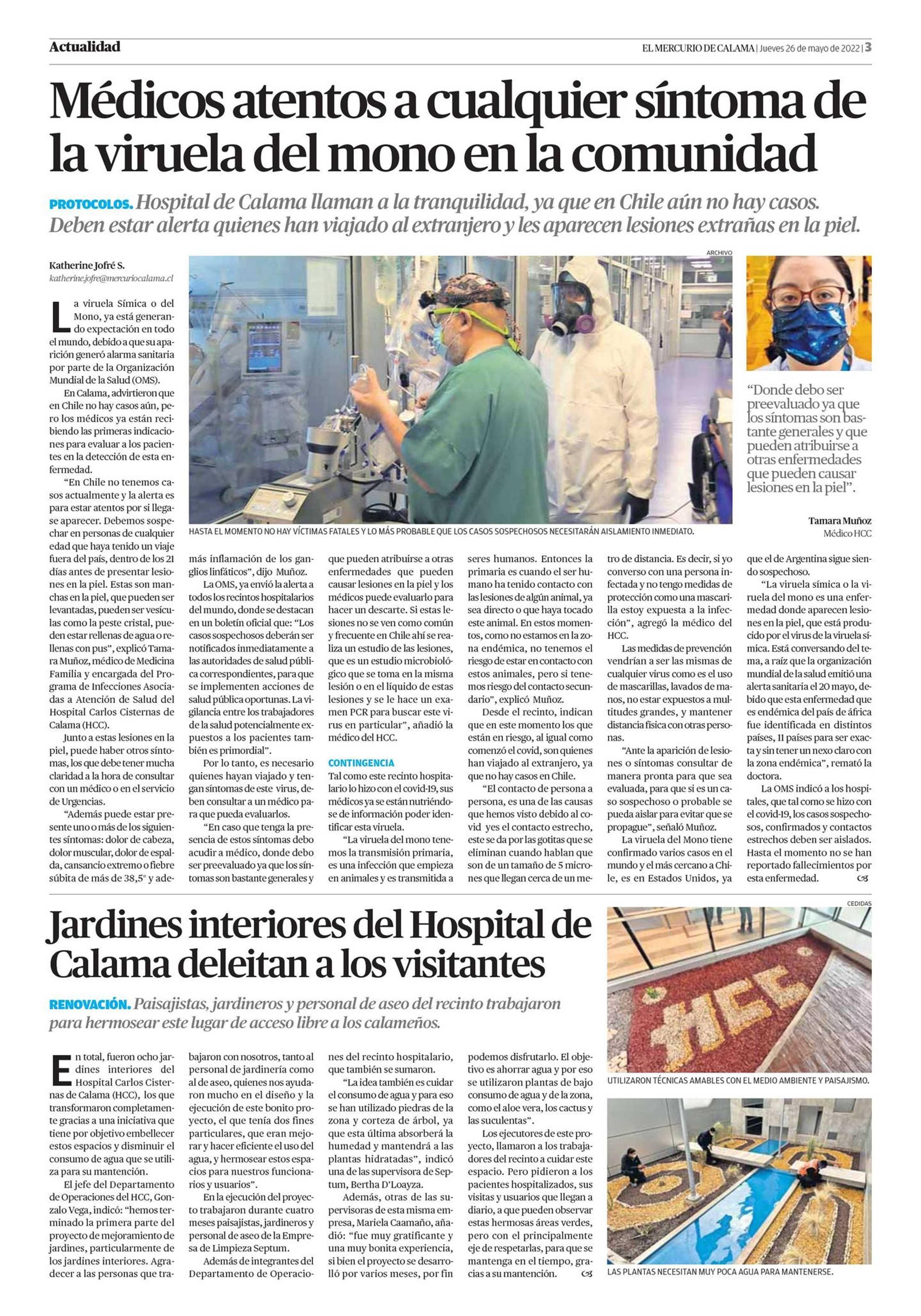 Médicos atentos a cualquier síntoma de la viruela del mono en la comunidad 26-05-2022 El Mercurio de Calama |