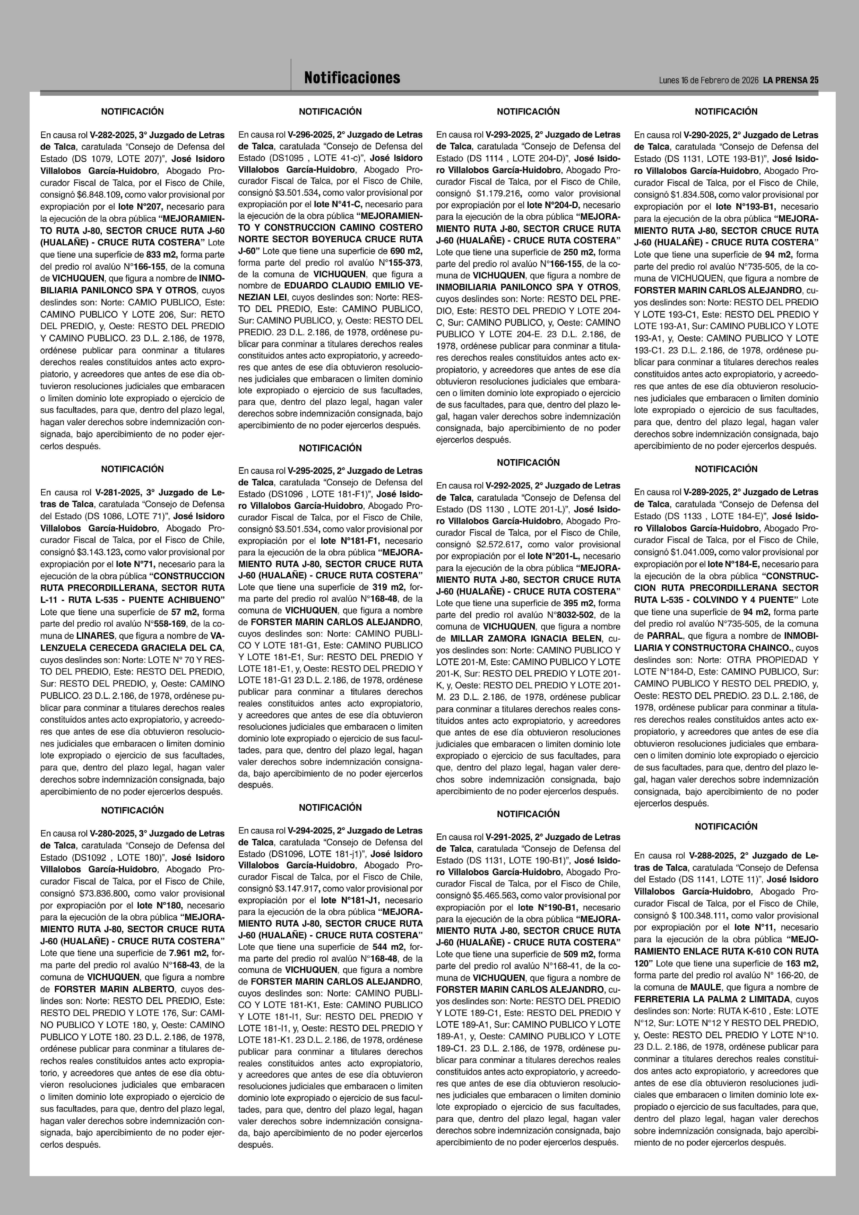 NOTIFICACIONES 16-02-2026 La Prensa de Curicó |