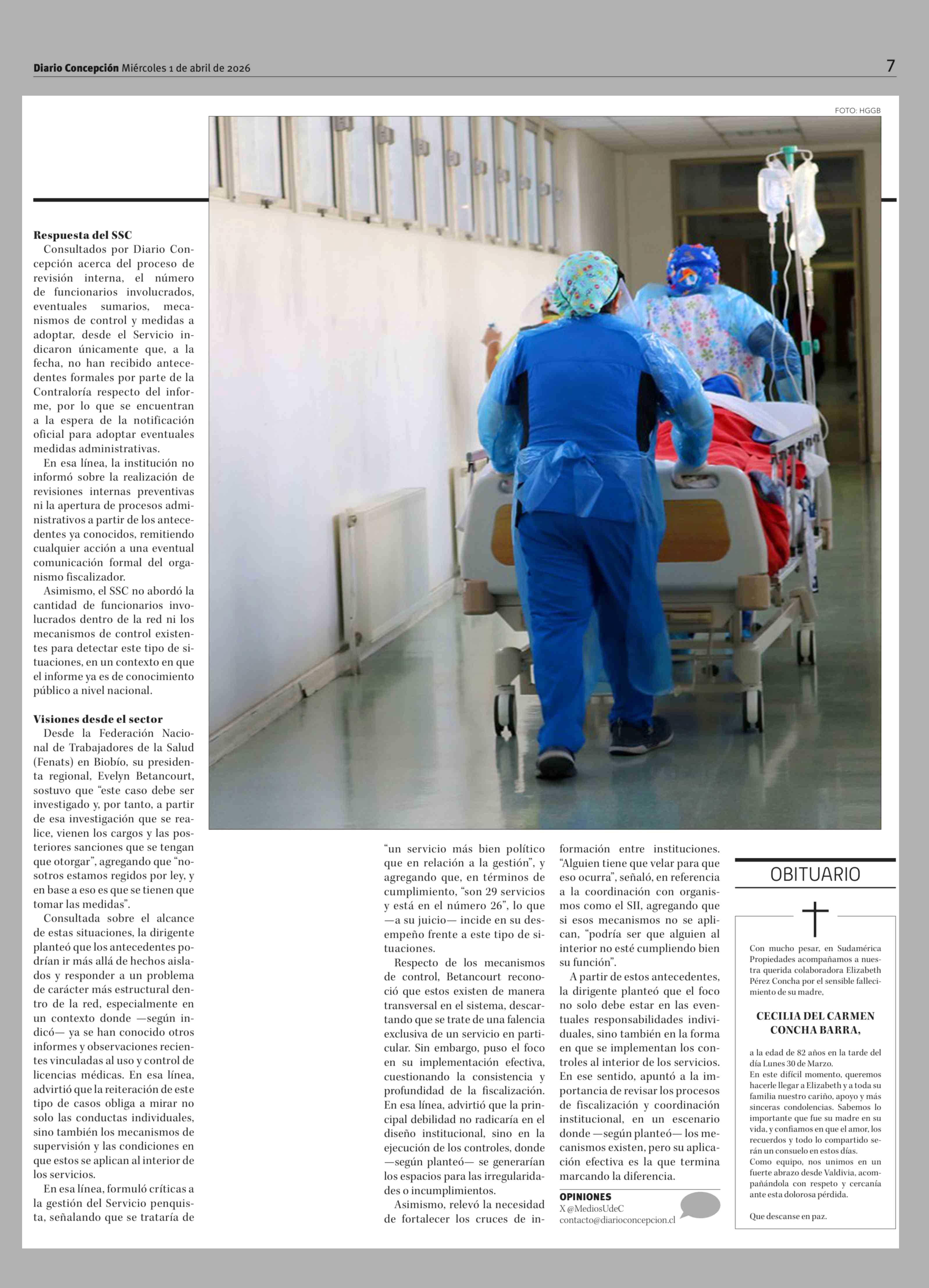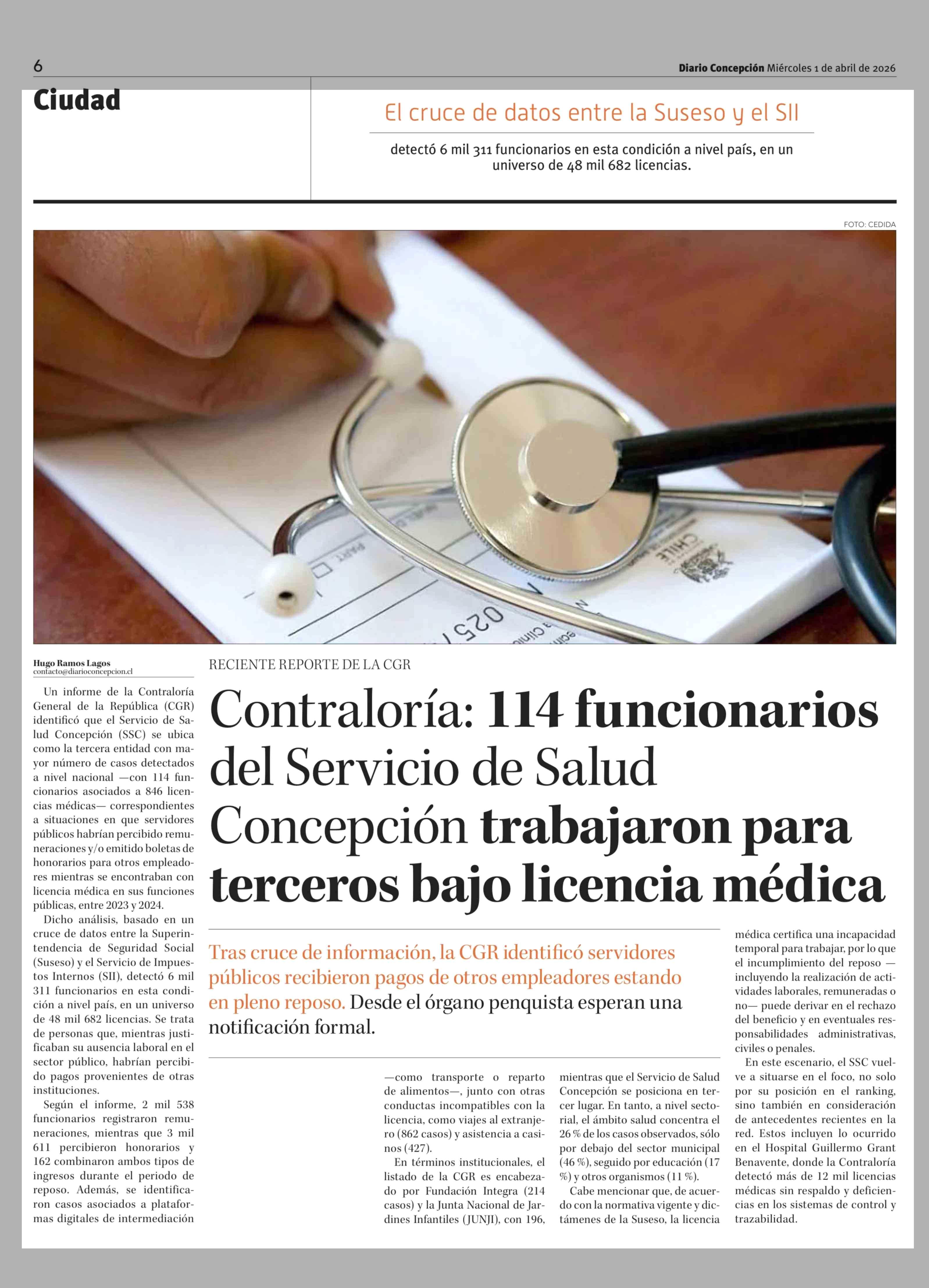 Contraloría: 114 funcionarios del Servicio de Salud Concepción trabajaron para terceros bajo licencia médica 02-04-2026 Diario Concepción |