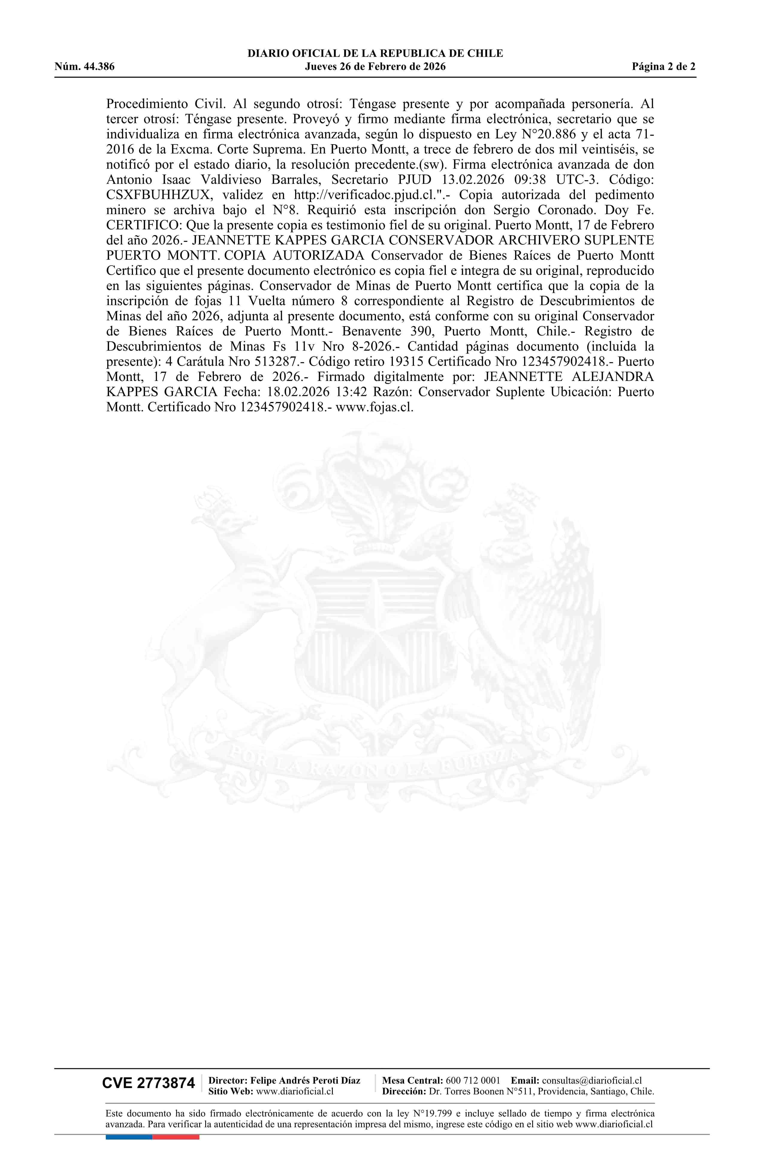 | Fuente: | DIARIO OFICIAL CHILE - BOLETÍN OFICIAL DE MINERÍA (DIARIO OFICIAL CHILE – BOM – PEDIMENTOS MINEROS) | Página(s): | 81-82 |