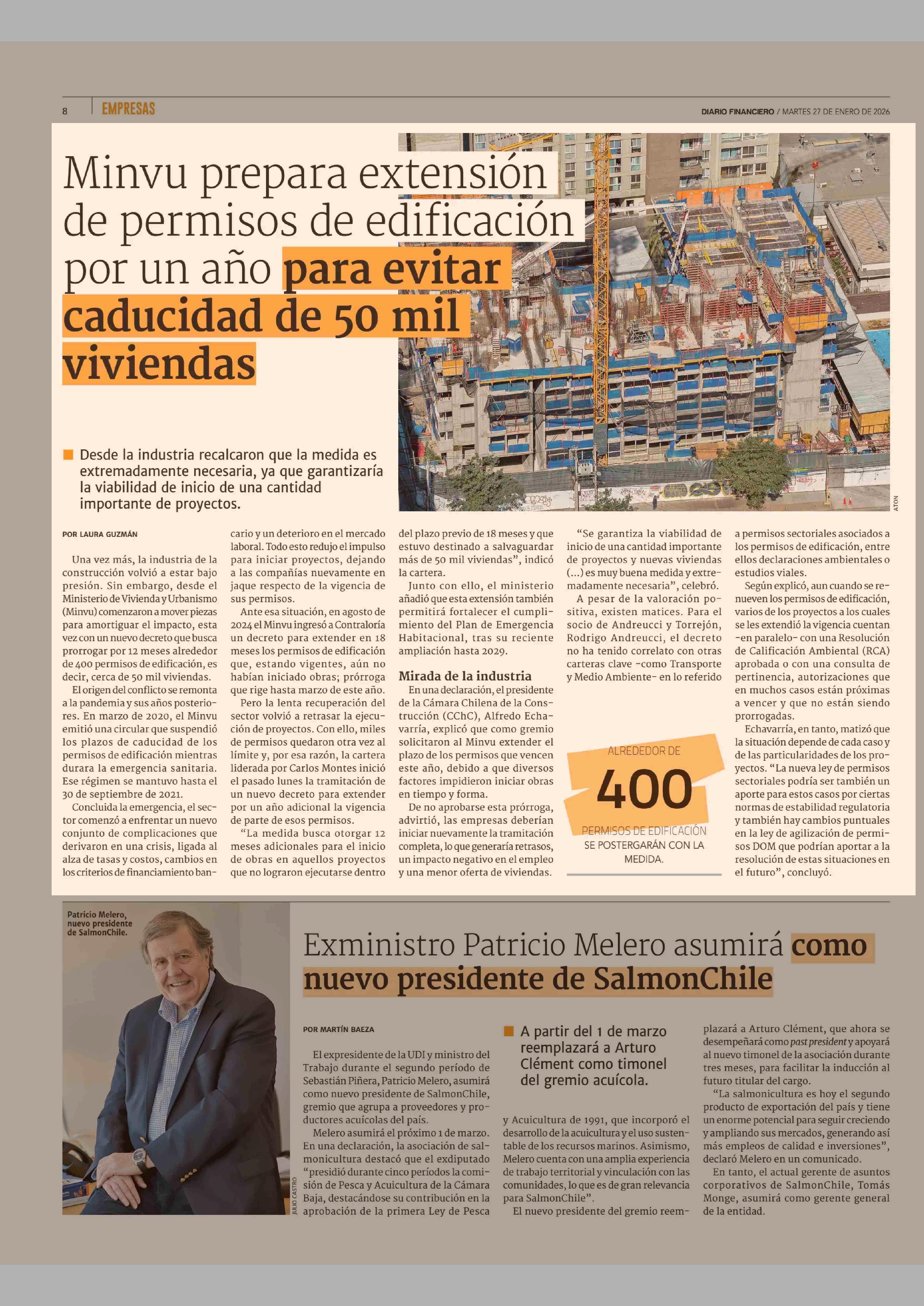 Minvu prepara extensión de permisos de edificación por un año para evitar caducidad de 50 mil viviendas 27-01-2026 Diario Financiero |