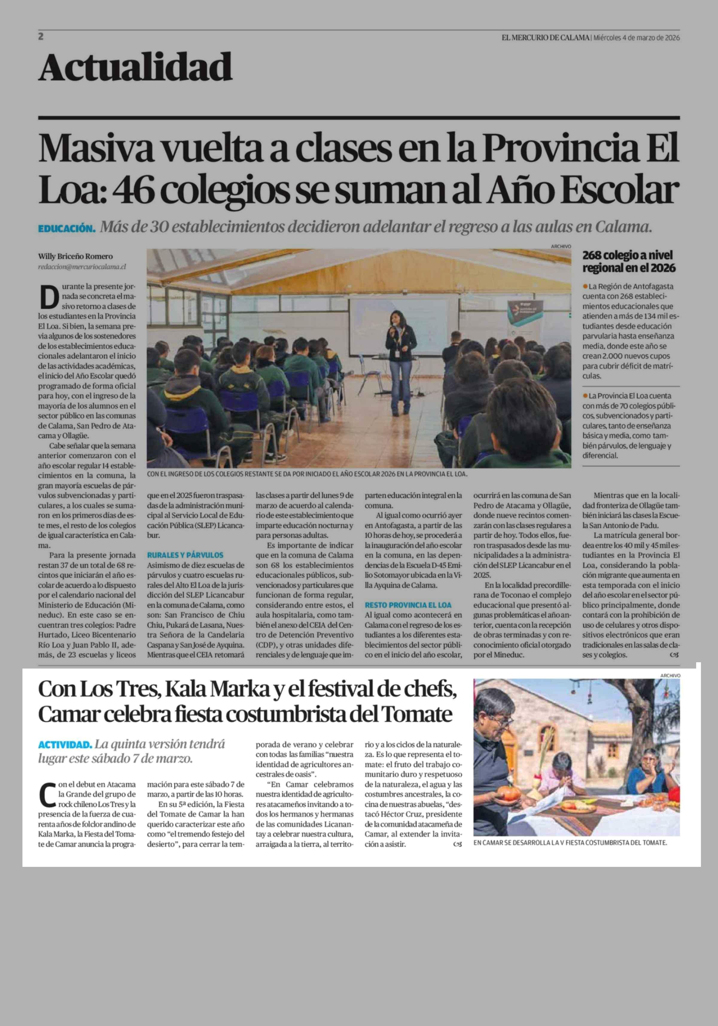 Con Los Tres, Kala Marka y el festival de chefs, Camar celebra fiesta costumbrista del Tomate 04-03-2026 El Mercurio de Calama |