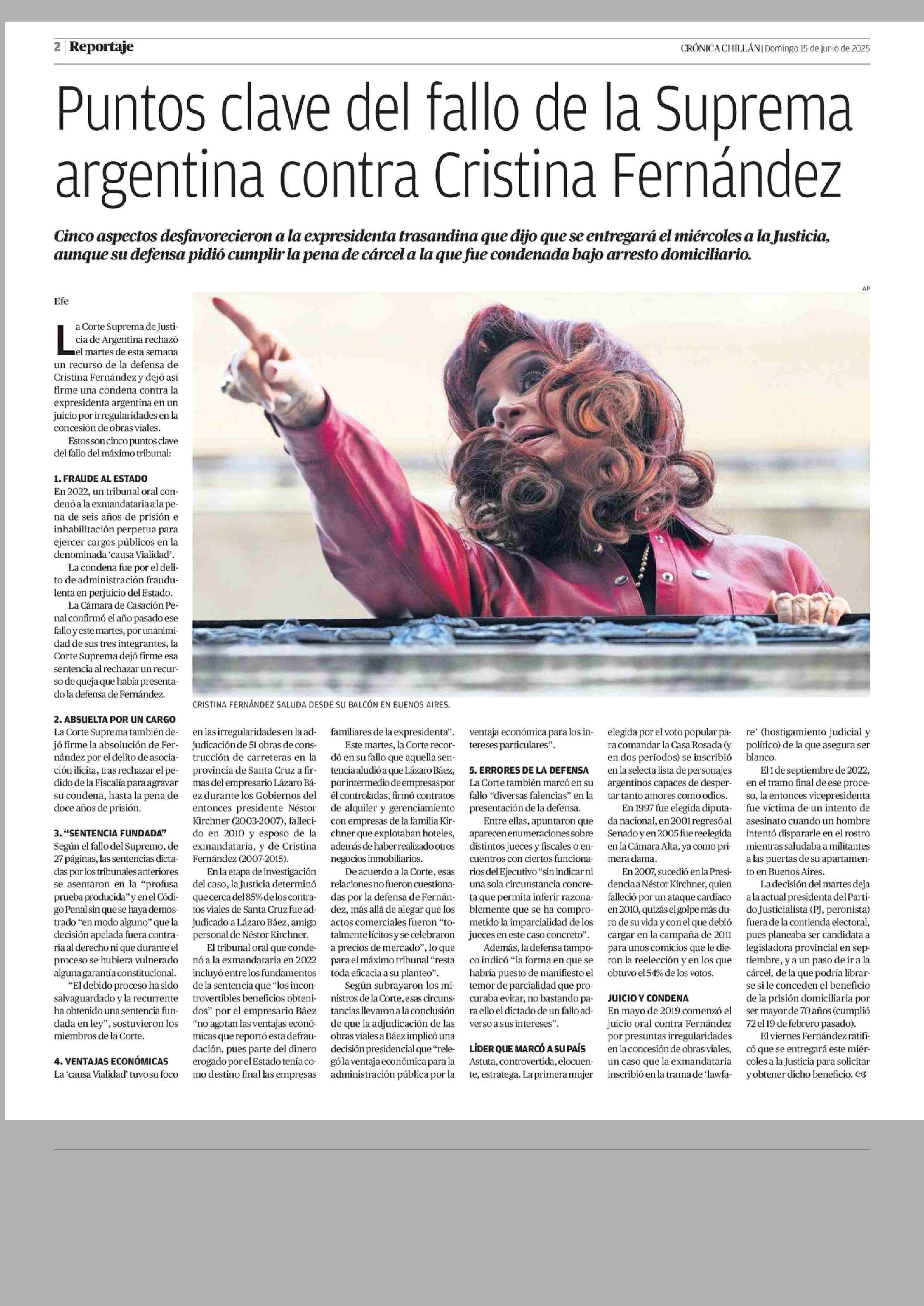 Puntos clave del fallo de 1 a Suprema argentína contra Cristina Fernández 15-06-2025 Crónica de Chillán |
