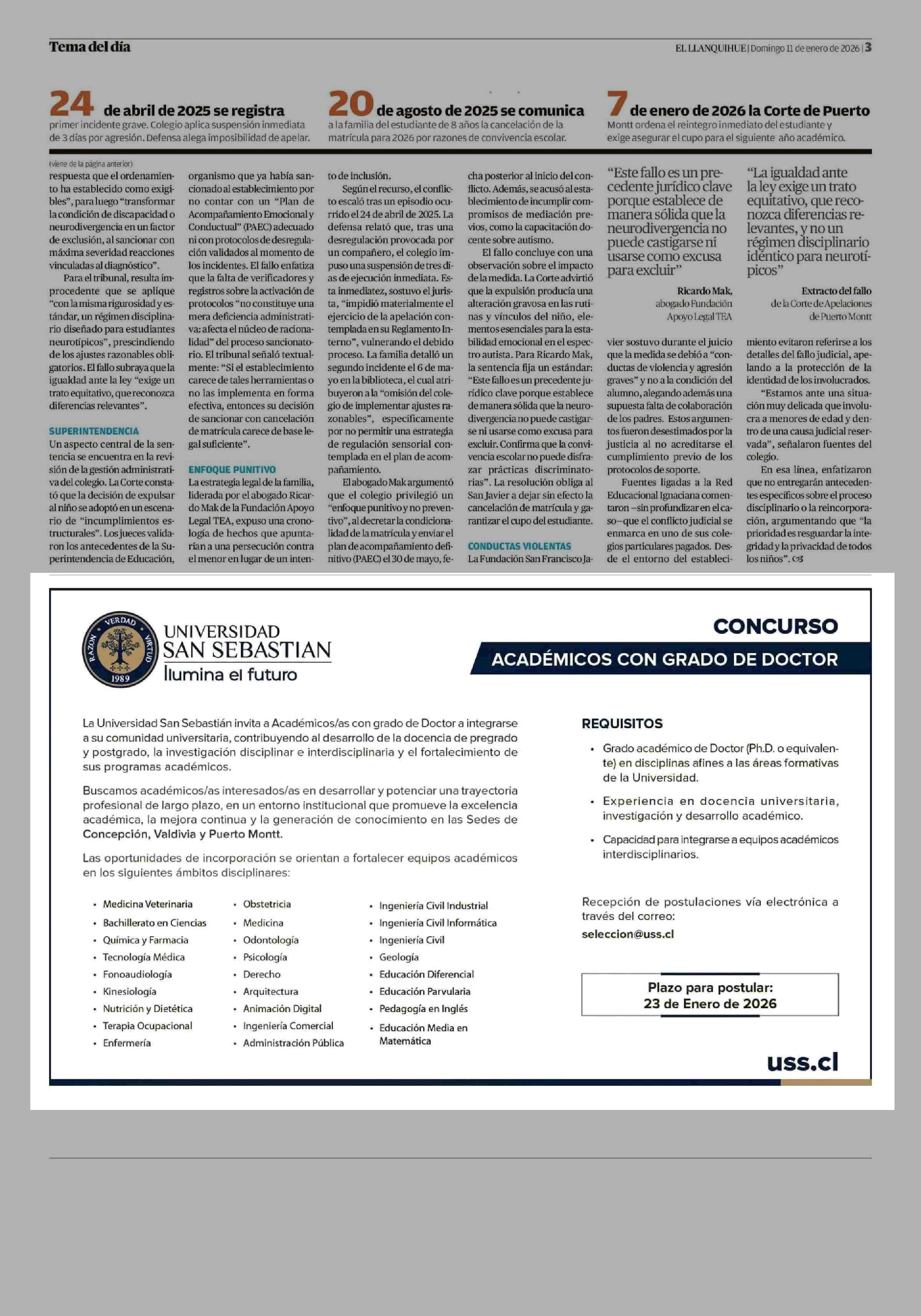 Aviso Licitaciones: UNIVERSIDAD SAN SEBASTIÁN 11-01-2026 El Llanquihue |