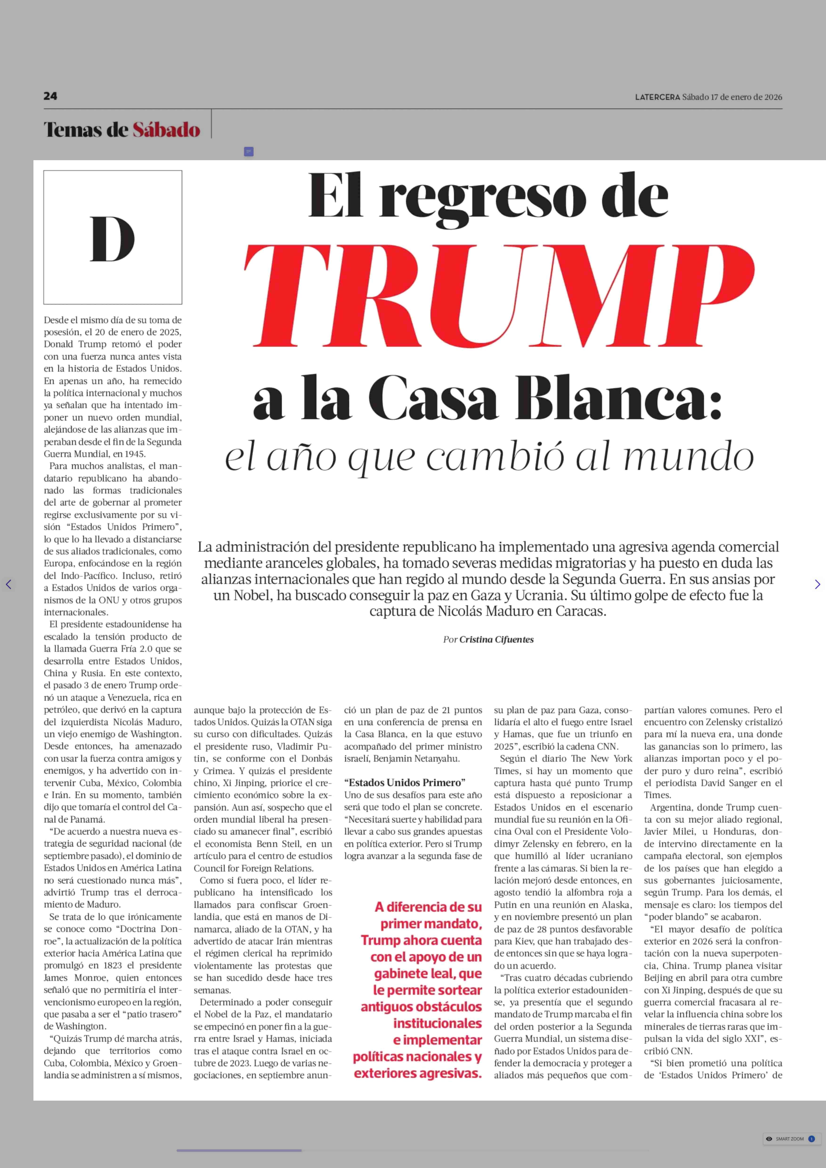 El regreso de TRUMP a la Casa Blanca:el año que cambió al mundo 17-01-2026 La Tercera |