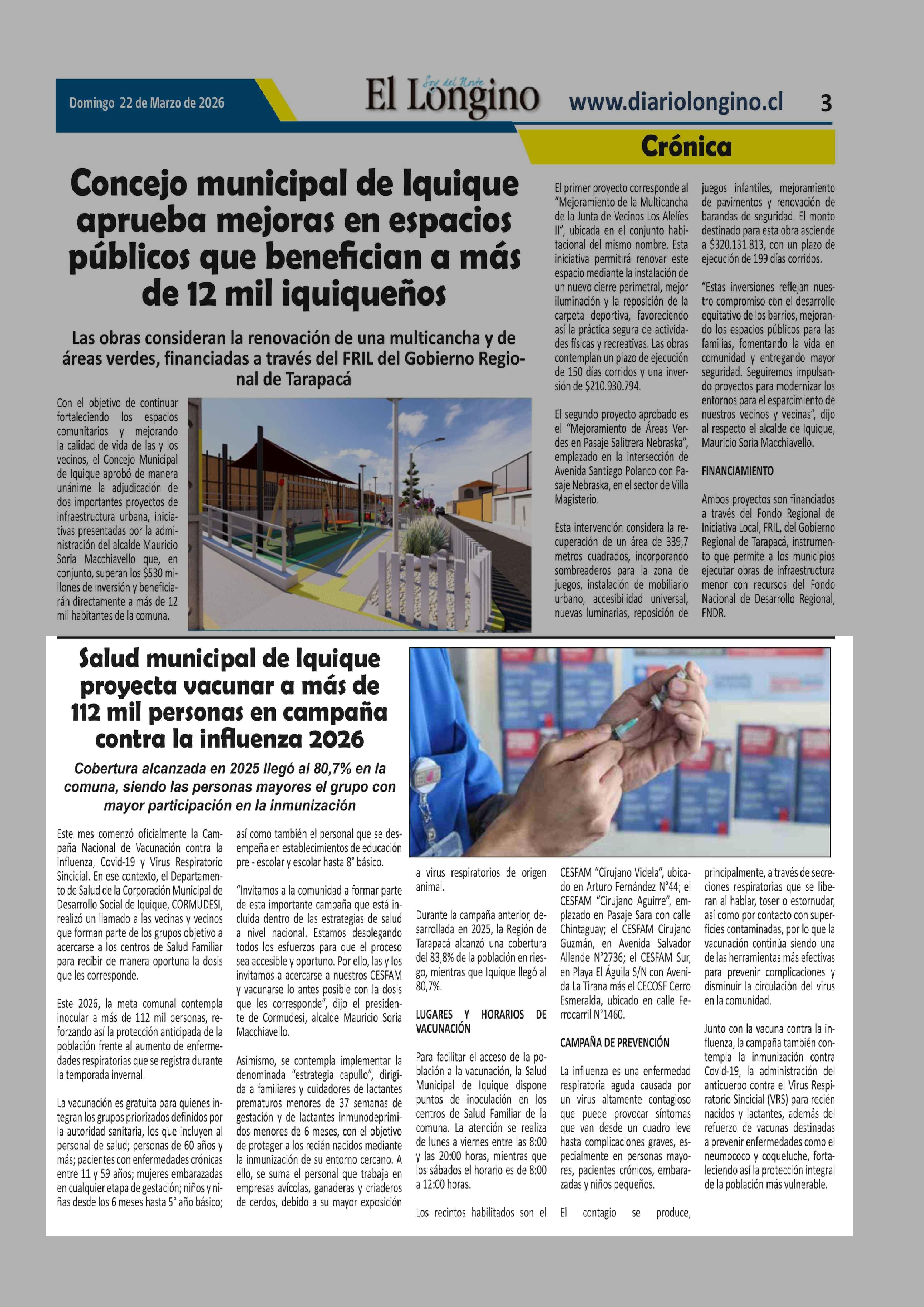 Salud municipal de Iquique proyecta vacunar a más de 112 mil personas en campaña contra la influenza 2026 22-03-2026 El Longino |