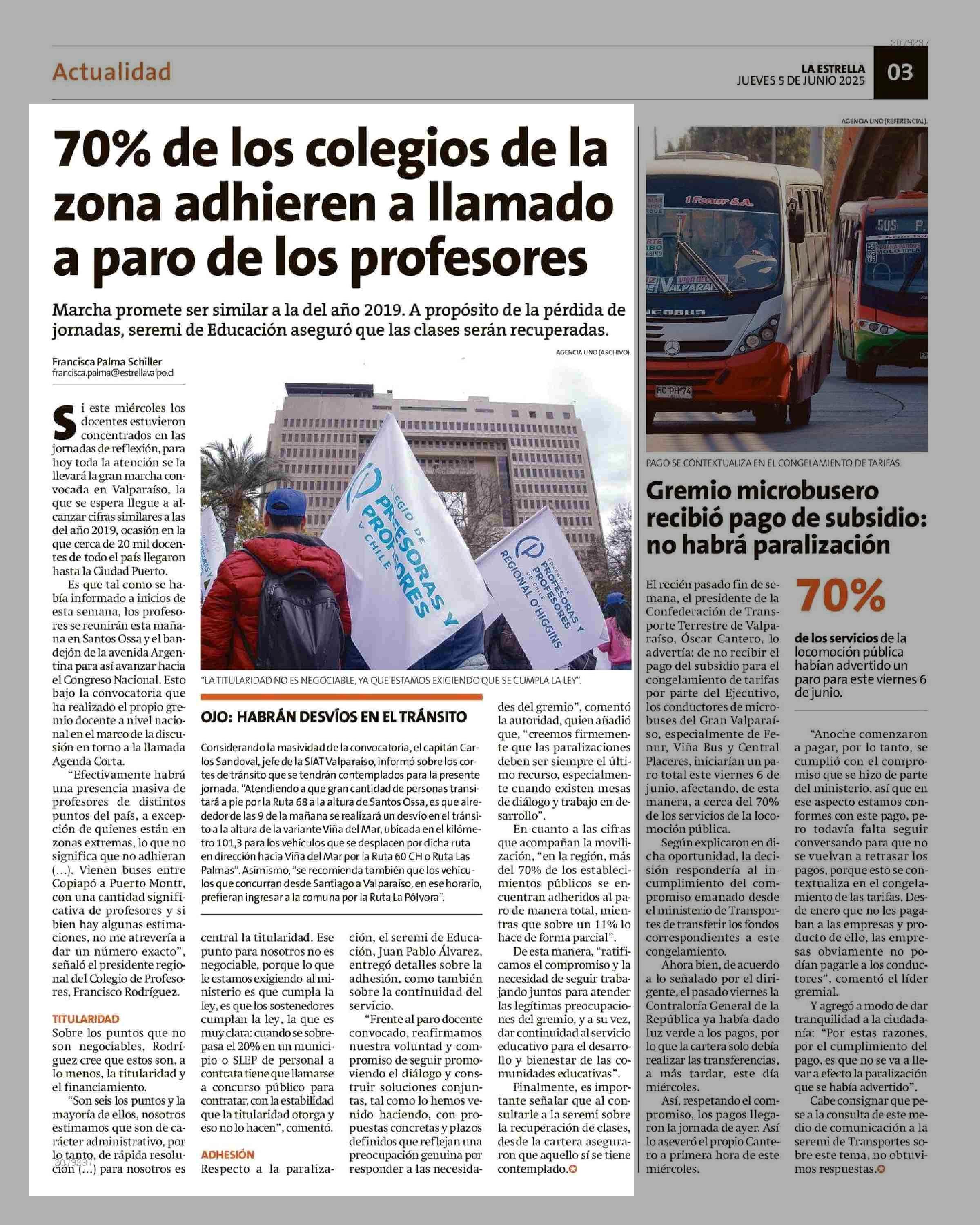 70% de los colegios de la zona adhieren a llamado a paro de los profesores 05-06-2025 La Estrella de Valparaíso |
